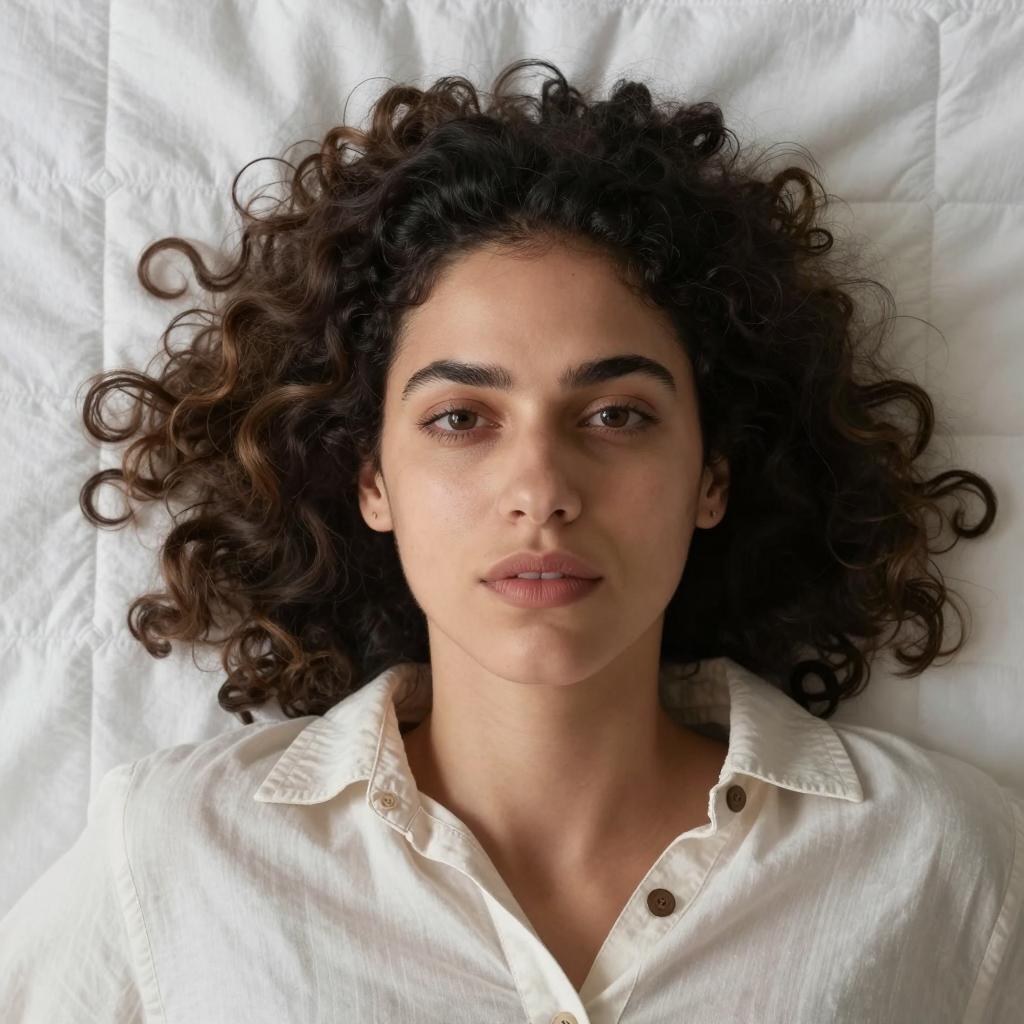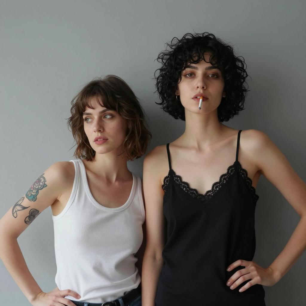 Two women with dark curly hair on a bed. The woman in front leans forward, wearing a strapless top, dark lipstick, and black nail polish. The woman behind holds her shoulder, wearing a white tank top, black nail polish, and a spider tattoo on her upper arm. Gray background. Intense expressions. Both women wear earrings. White bedsheet in the foreground.