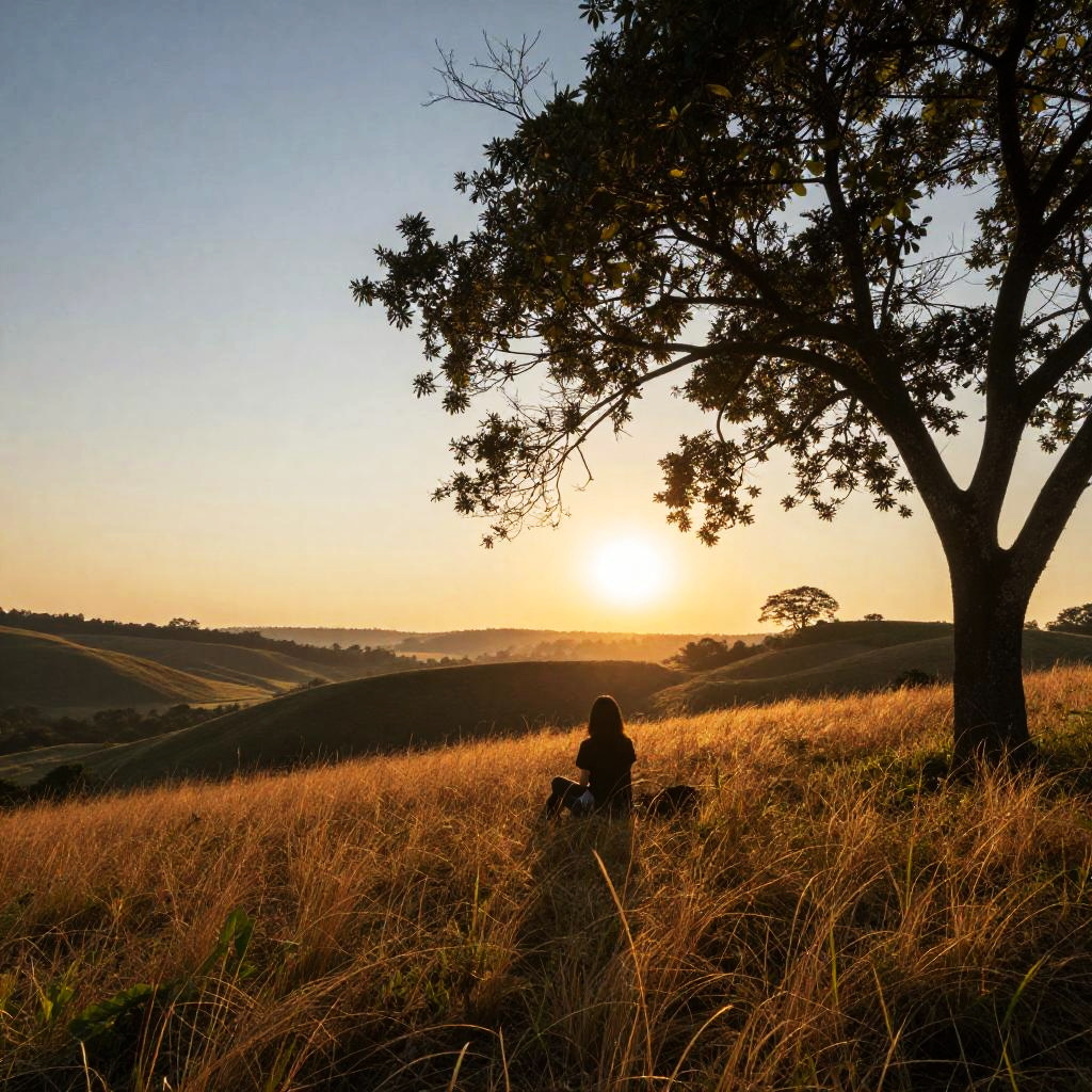 Photograph of a serene sunrise over a rolling hill landscape. A lone person with long hair sits on a grassy hilltop, silhouetted against the bright morning light. Golden grasses blanket the hills, leading to a distant valley. A large tree with sprawling branches stands to the right, casting shadows. The sky is a soft gradient of blue and orange. The scene feels peaceful and contemplative.