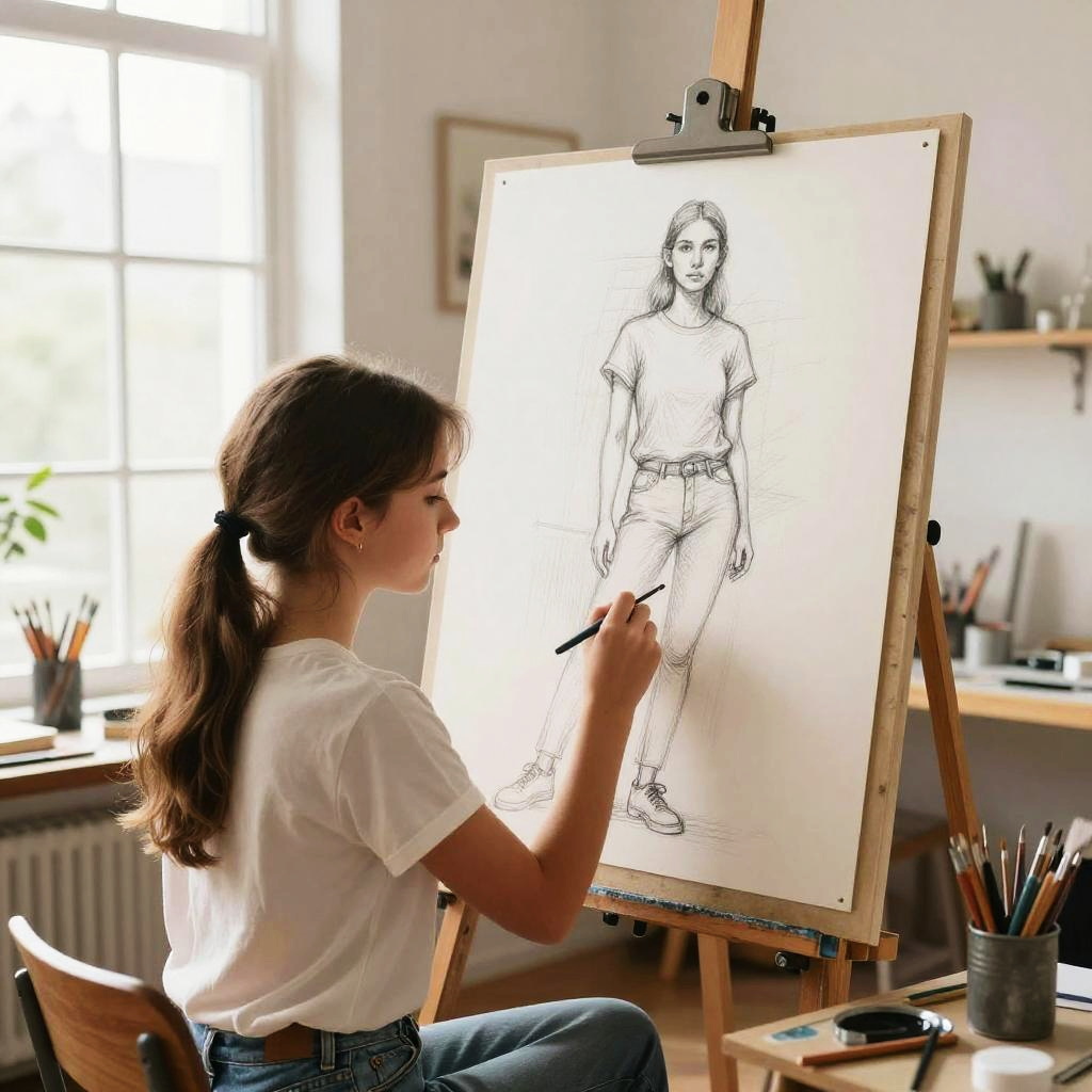 Girl drawing full body in a modern art classroom, focused on creating an anatomical study, with easel and charcoal, sunlight casting shadows, surrounded by other students working, clean lines and dynamic composition, semi-realistic style.