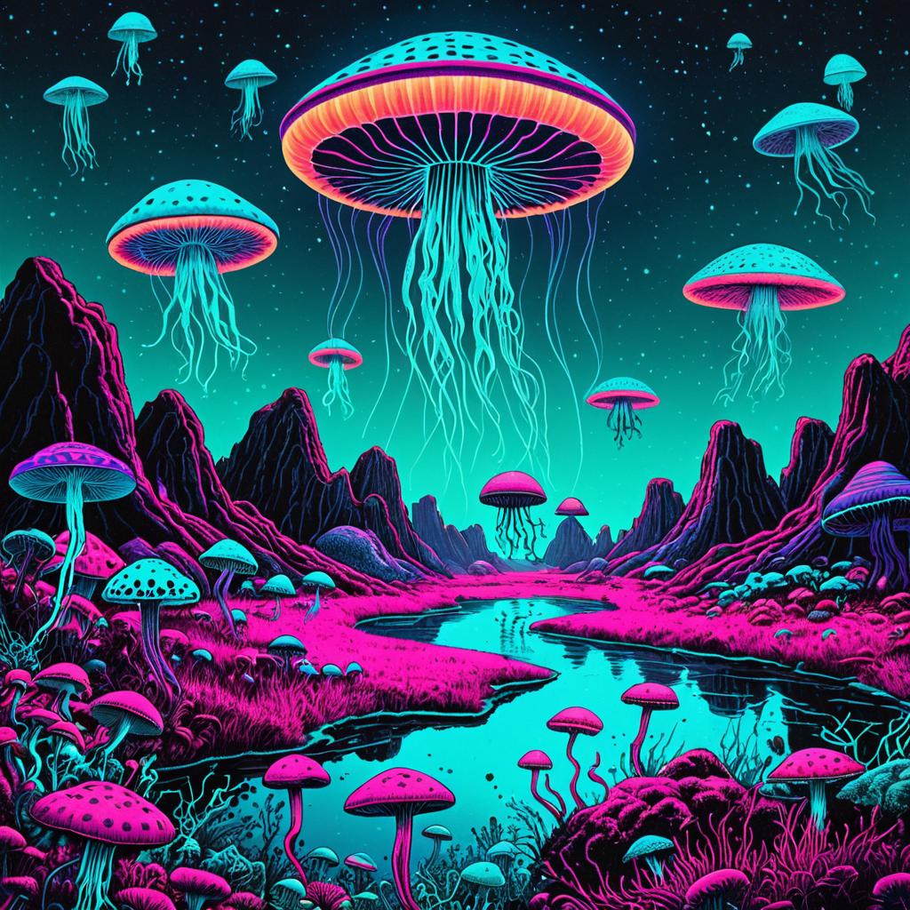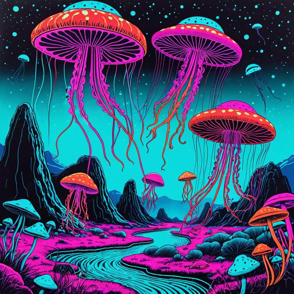 Vintage 70s black light poster of floating jellyfish, wearing funky hats, alien landscape, UFO flying saucers, psilocybin cubensis mushrooms, vibrant trippy colors, neon turquoise and magenta, psychedelic patterns