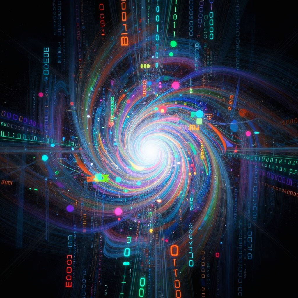 Neon-lit futuristic control room with swirling rainbow lights, multiple screens, and desks. Vibrant, digital art style with a galaxy-inspired background.
