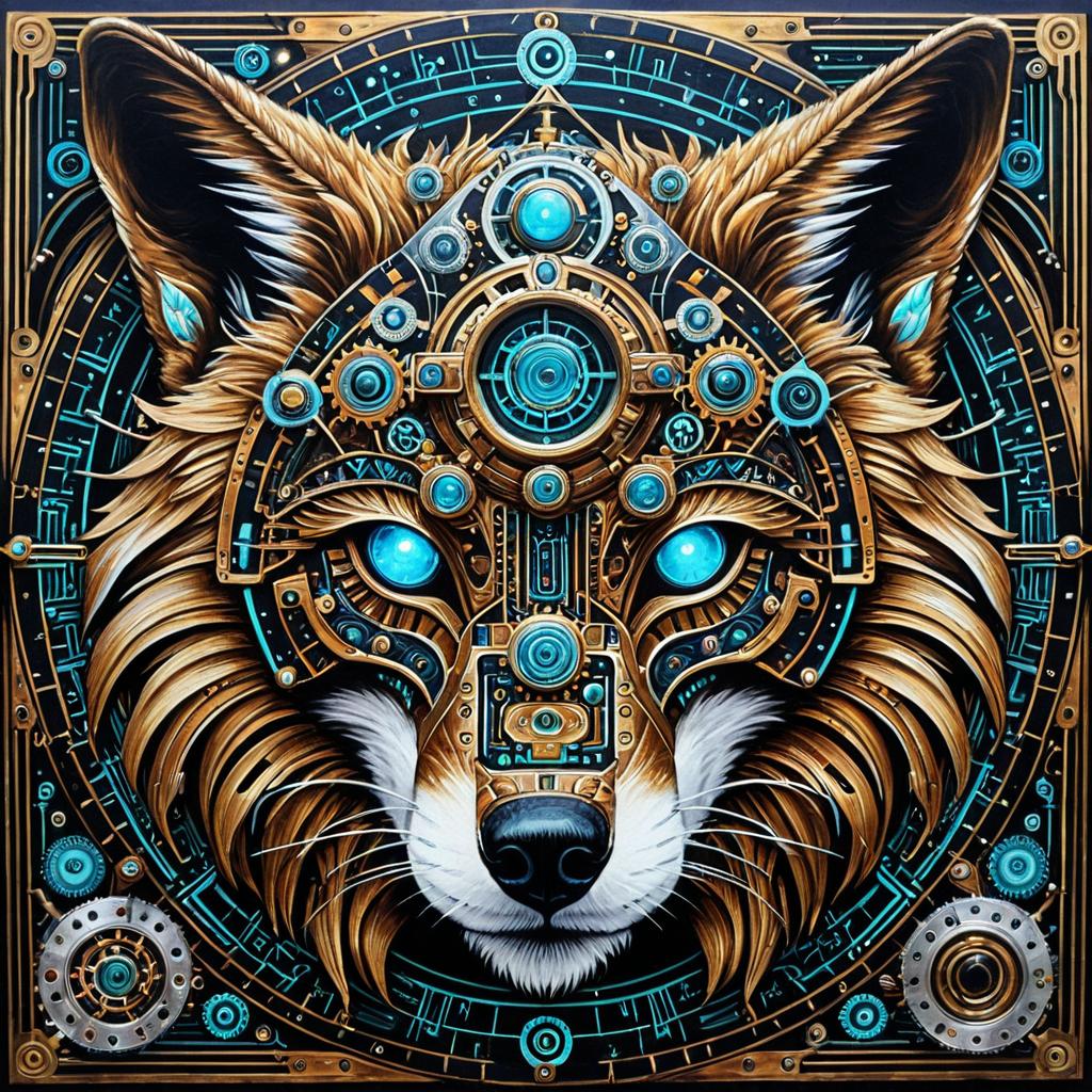Highly detailed steampunk-inspired digital painting of an astral wolf mask featuring intricate circuit board elements and glowing blue eyes. The artwork showcases symmetrical, surrealist, and spiritual abstract forms with metallic gold and turquoise accents, incorporating magic symbols and cosmic motifs.