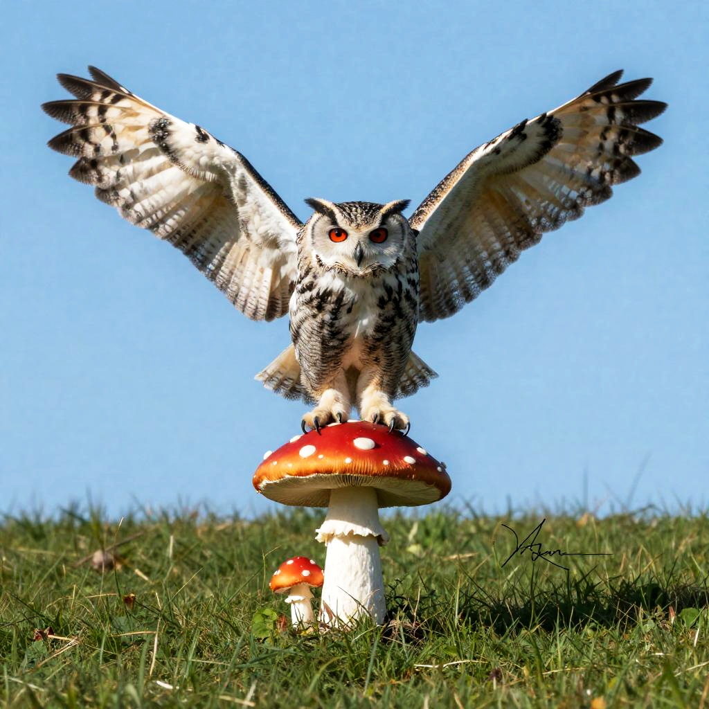 Swooping Red-Eyed Owl Above Mushrooms