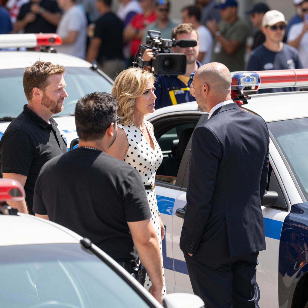 Photograph showing a distressed muscular man with dark hair wearing a patterned dark gray shirt covering his face with his hand. Next to him stands a middle-aged man with gray hair and a mustache, dressed in a gray suit and light blue shirt, holding papers and looking to the side. Behind them, several people including police officers in uniform and other individuals wearing sunglasses are gathered. A metal railing separates the crowd from the foreground in a bright outdoor setting.
