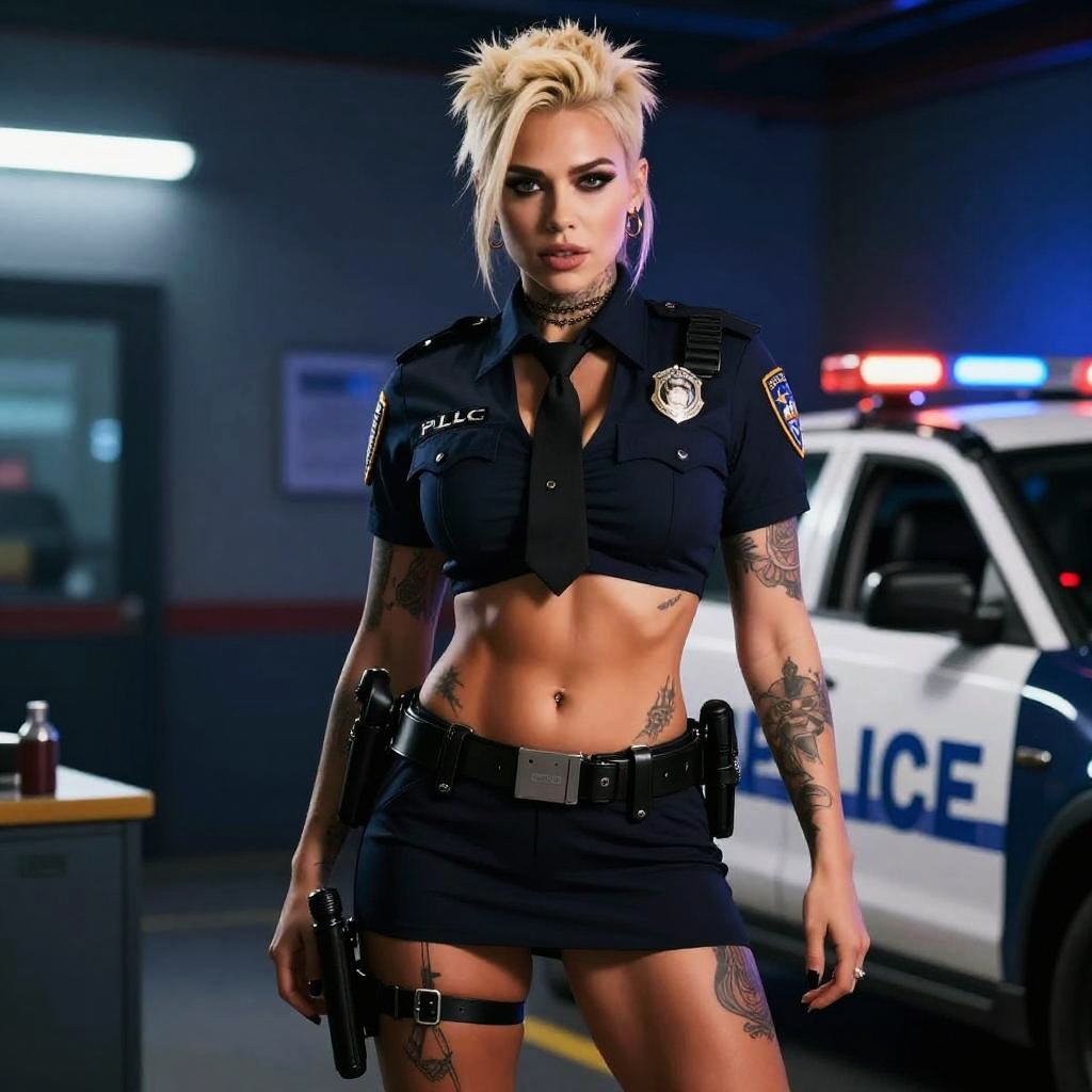 Realistic photo.Gorgeous muscular 28-year-old Romanian drag queen (with strong masculine jawline and brow) police officer with ridiculously long flowing platinum blonde wavy hair, wearing police uniform with a knee-high pencil skirt and 8 inch stiletto high heel shoes, posing under a neon lights on a rainy street. realistic photo