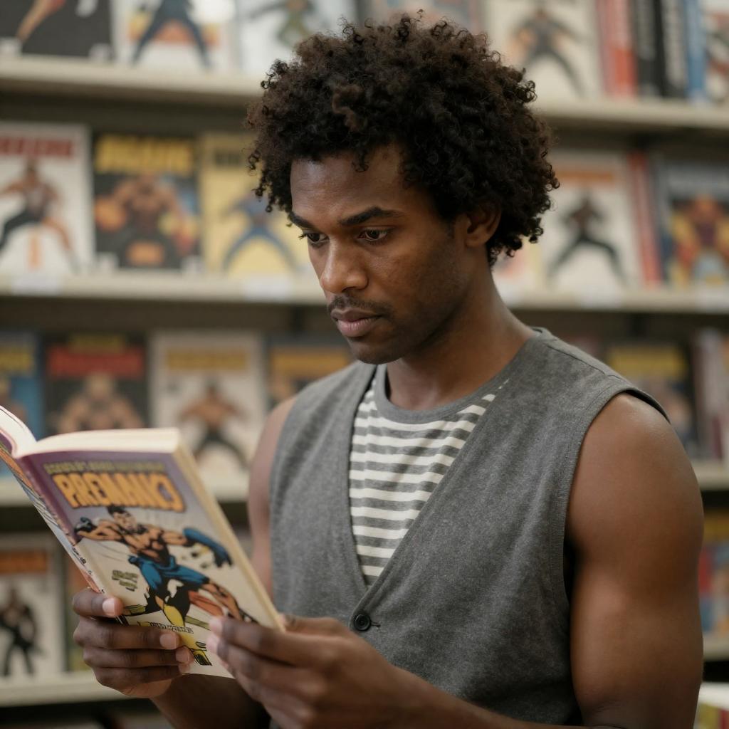 Photograph of a man with blonde hair and beard, wearing a navy shirt and jeans, climbing a wooden staircase. He holds a colorful comic book. Two people, one with long blonde hair, one with gray hair and a gray suit, face him. Wooden ceiling with beams, wooden walls. Man's intense gaze, comic book's vibrant cover. Two people in foreground, one looking up, one looking at the man.