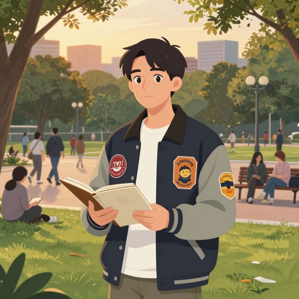 Digital illustration of a young man with short black hair, fair skin, and a slight build, standing in a park during sunset. He wears a navy and gray varsity jacket with two colorful patches on the sleeves, a white t-shirt, and gray pants. He holds an open book in both hands, looking slightly concerned. The background features a grassy lawn with trees, a pathway with people sitting on benches, and distant buildings. The sky is orange and yellow, indicating sunset. The art style is vibrant and cartoonish.