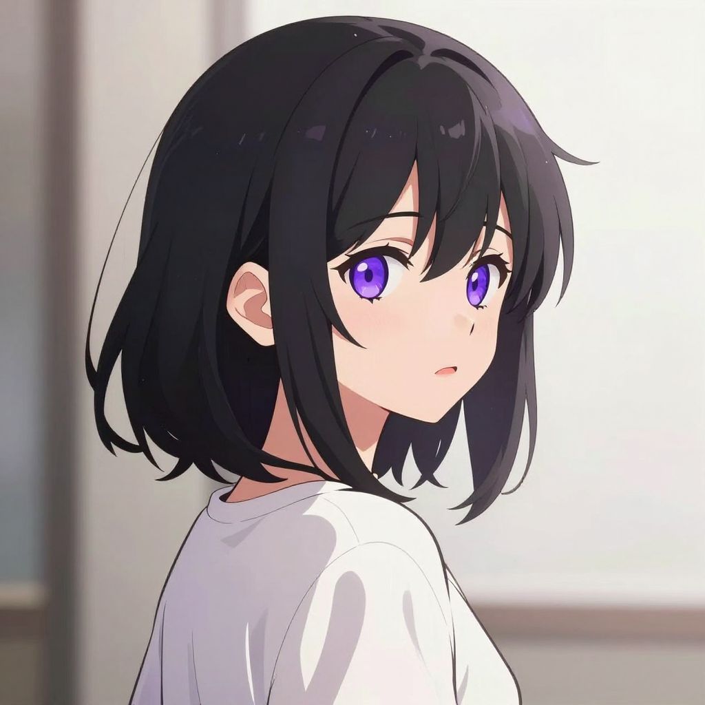 Digital anime-style drawing of a young woman with short, black hair and large, vibrant purple eyes. She has a fair skin tone and is wearing a plain white t-shirt. Her expression is neutral, with a slight, curious gaze as she looks over her shoulder towards the viewer. The background is blurred with soft, muted colors, suggesting an indoor setting with natural light. The art style features clean lines and bright, contrasting colors, typical of modern anime illustrations.