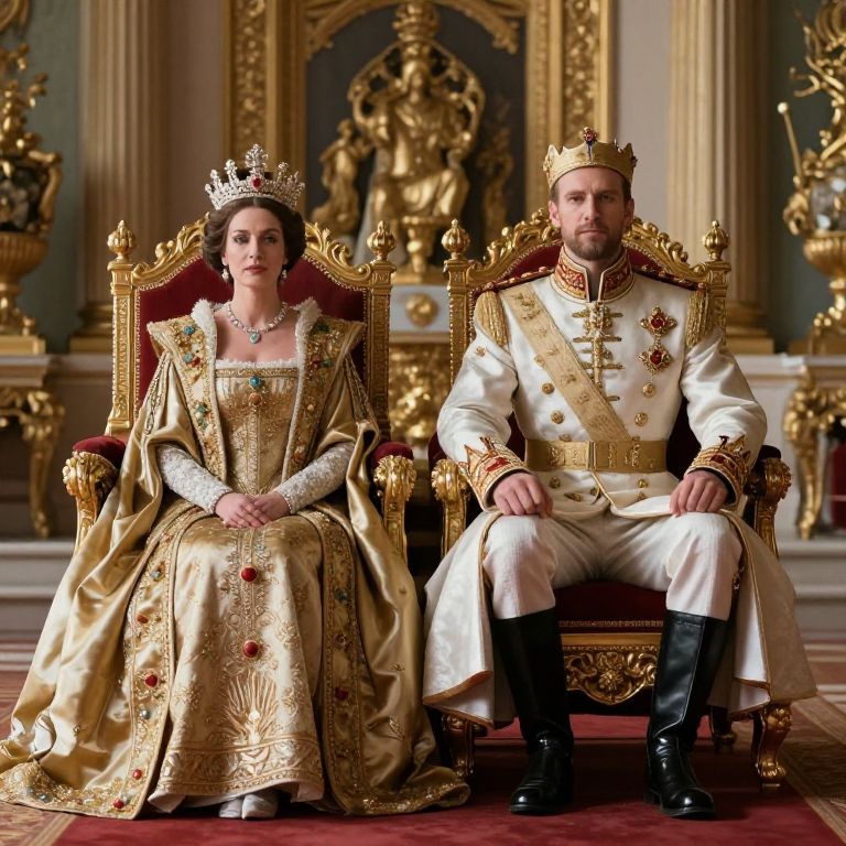 Portrait of a queen and king sitting majestically on their thrones, wearing highly detailed, regal attire in a grand, ornate room that illustrates wealth and power.