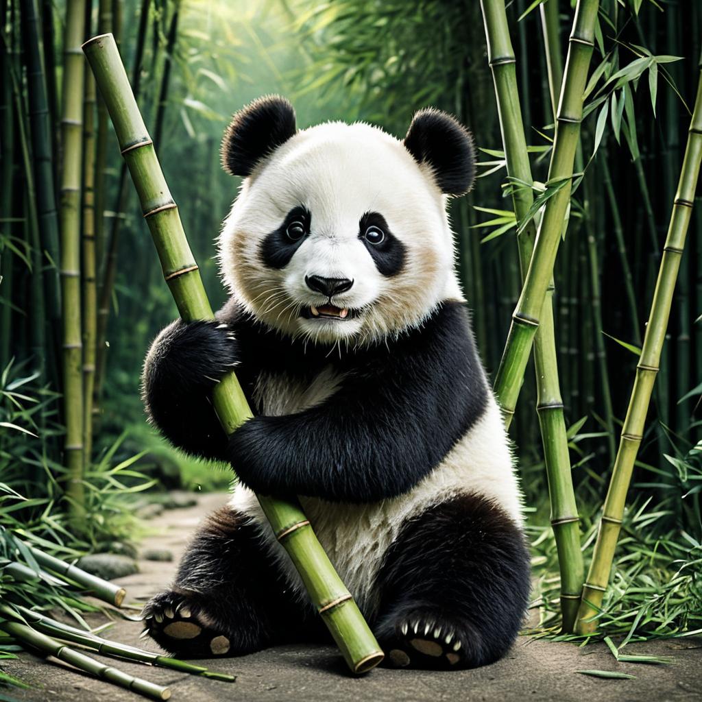 A heartwarming image of a joyful panda cub sitting amidst a dense bamboo forest. The young panda is holding bamboo sticks, showcasing its playful nature. The scene is inspired by the whimsical and detailed animation style of Hayao Miyazaki, capturing a vibrant and lush green environment perfect for the panda's habitat.