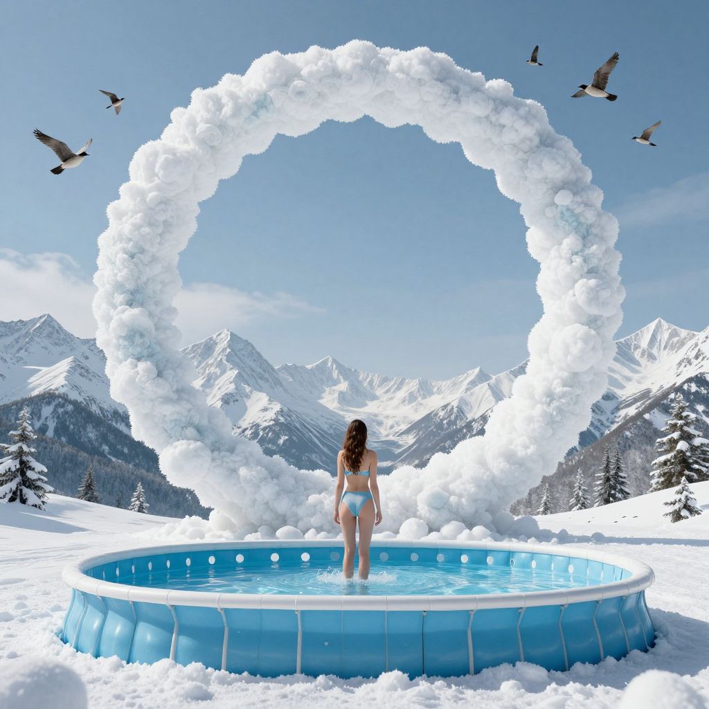 Photograph-like digital artwork of a woman in a blue bikini standing in a circular, inflatable blue pool in a snowy mountain landscape. She faces away, gazing at a large, white, cloud-like arch overhead. Snow-covered mountains and evergreen trees surround the pool, with several birds flying in the clear blue sky. The scene combines a surreal, dreamlike quality with realistic elements, highlighting the contrast between the icy environment and the bright blue pool and sky.