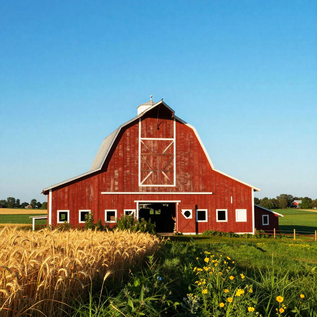 Red barn with white trim standing proudly in the middle of a lush green farm under a vibrant blue sky, rustic wooden textures detailed, surrounded by fields of golden wheat and wildflowers, warm sunlight casting gentle shadows, peaceful countryside scene.
