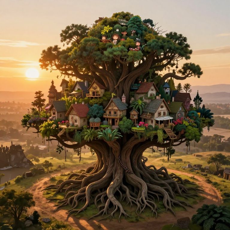 A breathtaking bird's eye view reveals an enchanting, post-apocalyptic panorama featuring a colossal, primordial tree with sprawling roots delving deep into the earth below it. The tree's twisted, contorted branches provide shelter and sustenance to a small, flourishing community that has formed within its embrace, complete with intricately crafted dwellings and lush gardens. This captivating scene is illuminated by the warm, golden light of sunset, accentuating the vivid hues of the flora and structures while casting dramatic shadows across the barren landscape. As the sun descends further, it casts a gentle glow upon the faces of the inhabitants peeking out from behind their cozy homes, evoking a sense of awe, perseverance, and optimism amidst the desolate surroundings. The lush color palette, intricate architectural details, and captivating atmosphere are reminiscent of both the expressive post-impressionist style and the whimsical world-building found in renowned animated films.