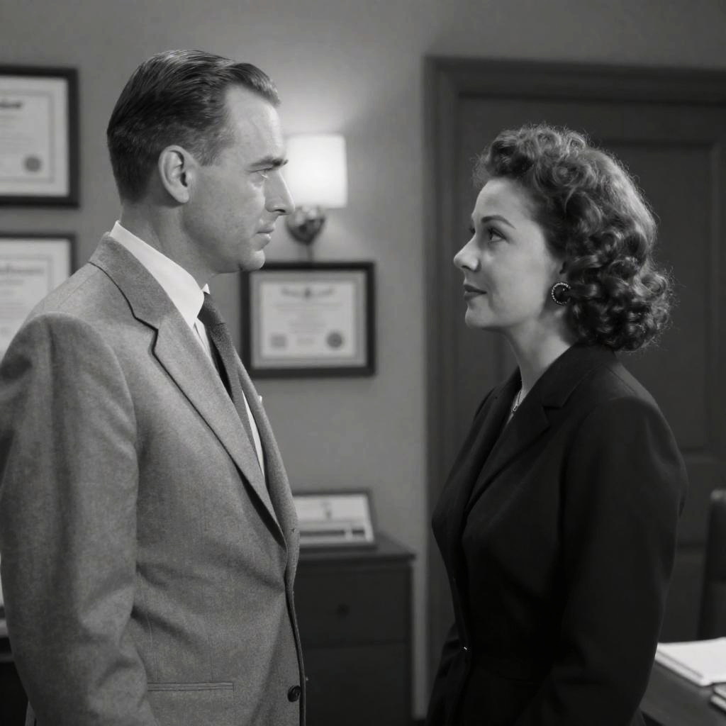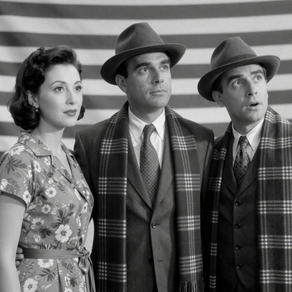 Black and white photograph featuring three adults standing close together. On the left is a woman with short wavy hair wearing a floral dress and pearl earrings. The middle man wears a suit, tie, plaid scarf, and a hat, looking upward. The man on the right is also in a suit, patterned tie, plaid scarf, and hat, with a surprised expression. The background consists of horizontally striped fabric, creating a classic retro atmosphere.