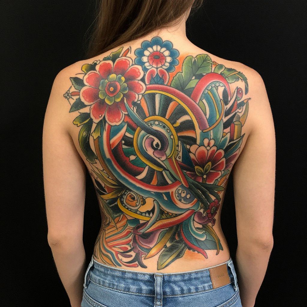 Photograph of a woman standing with her back to the camera, showcasing a large, vibrant tattoo covering her entire upper back. The tattoo features colorful, intricate designs with a mix of flowers, birds, and abstract patterns. She has light skin and brown hair tied back, wearing blue jeans. The background is solid black, making the tattoo stand out vividly.