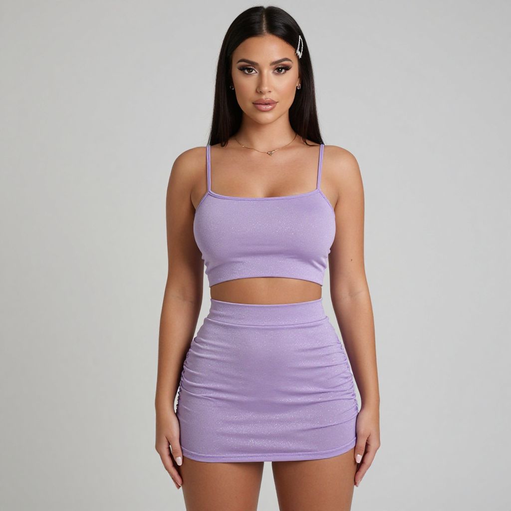 "Woman, contemporary glam, matching two-piece set in lavender with glitter finish, spaghetti-strap crop top, high-waisted fitted mini skirt with ruched side, silver barrette in hair, white studio background.. Sexy. Pretty face and beаutiful eyes. Big breasts."
