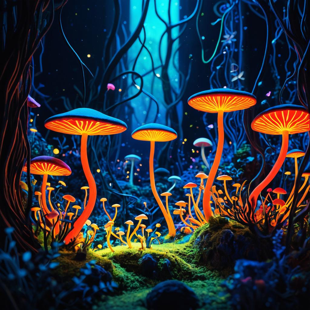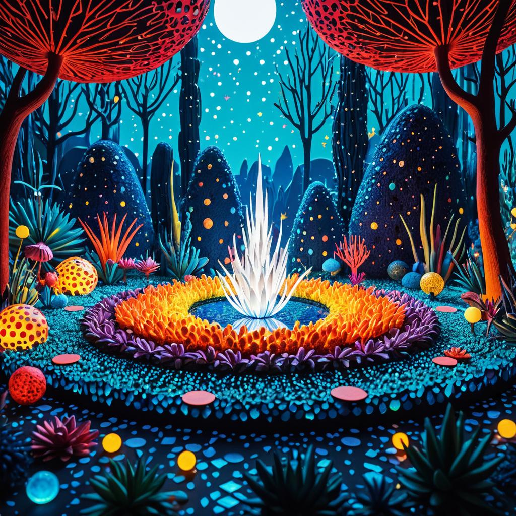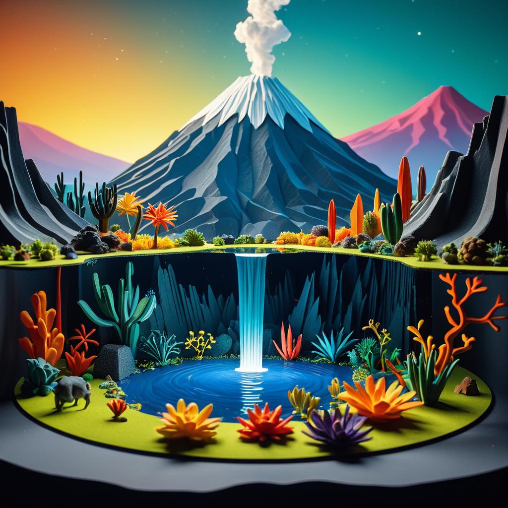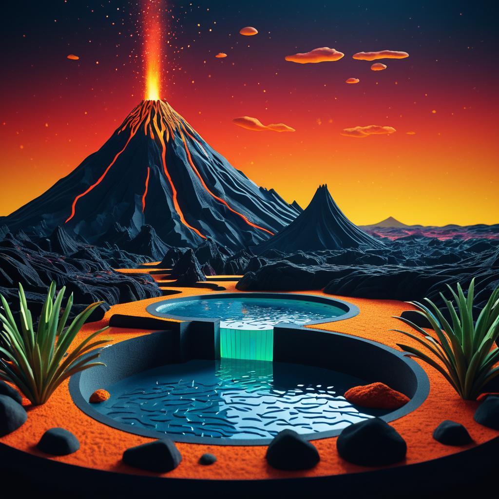 A photorealistic 3D rendered miniature surreal landscape featuring a glowing volcanic eruption in the background. The scene includes a circular water pool surrounded by vibrant, colorful plants and unusual vegetation. Jagged black rocks frame the landscape, illuminated with cinematic lighting. The style is inspired by Henri Matisse and Georgia O'Keeffe, combining bold colors and intricate details to create a magical, alien-like natural environment.