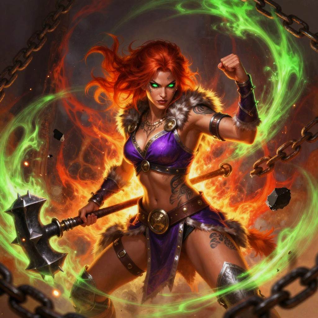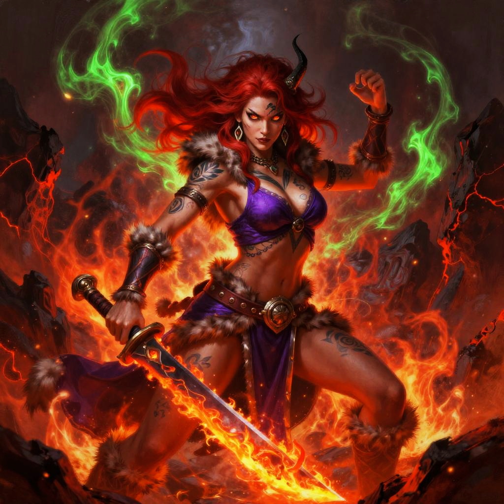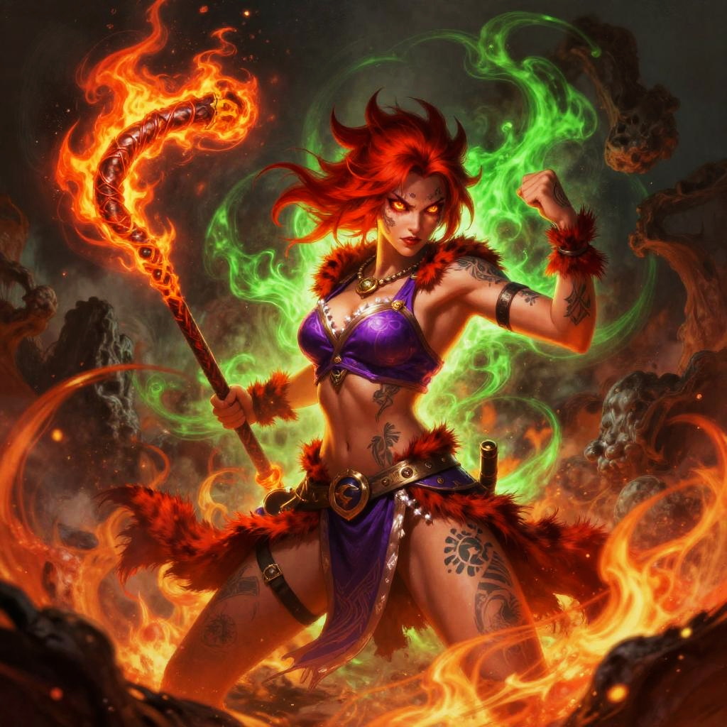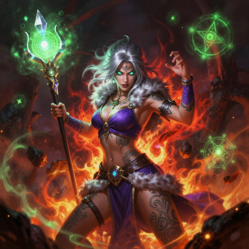This is a vibrant digital painting of an icy silver-haired glacial mage woman with glowing eyes and tattooed skin, clad in a purple top, fur armbands, and a belted skirt. She brandishes a frostbound shard blade and holds an aggressive stance with one hand raised. The scene surges with fiery red and eerie green energy, surrounded by ice crystal formations and swirling blizzard, embers, and arcane currents, ultra-detailed, dramatic lighting, high contrast.
