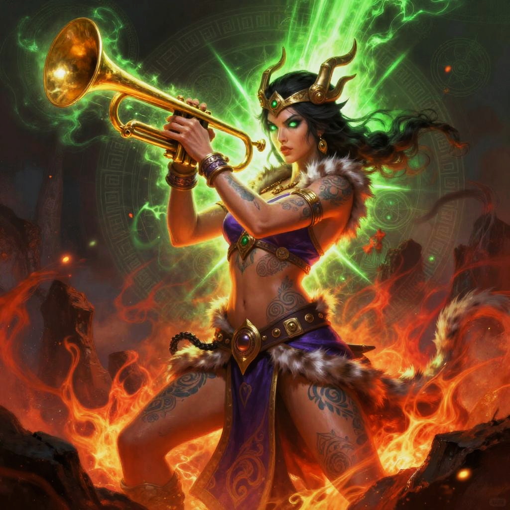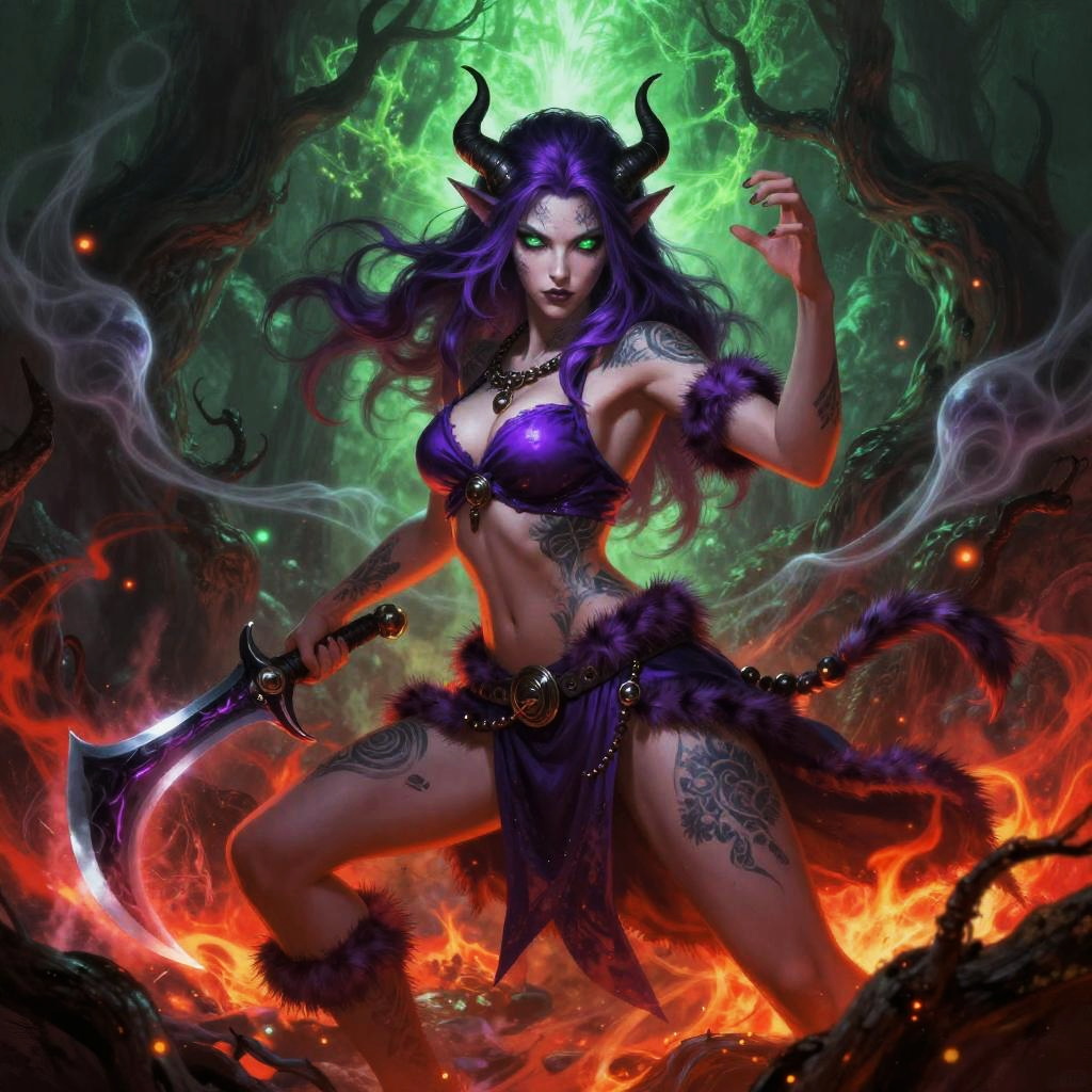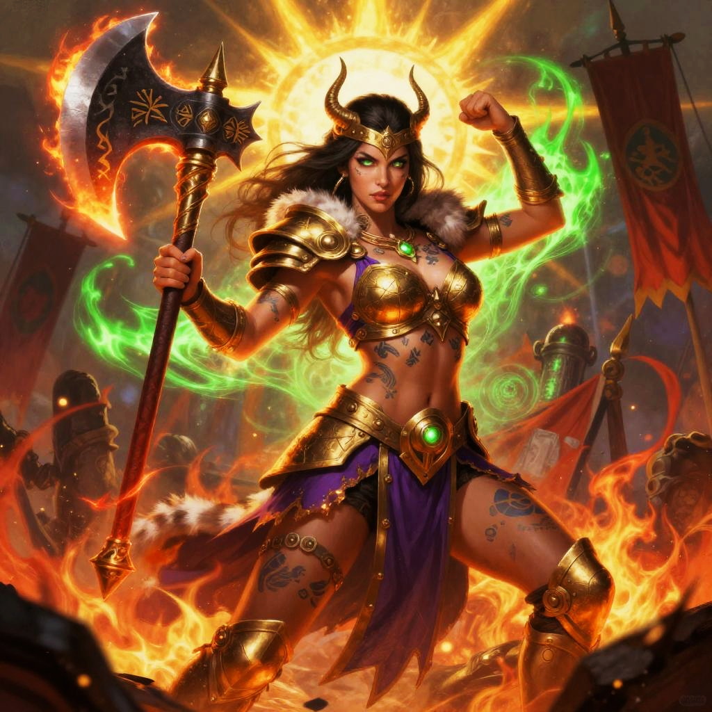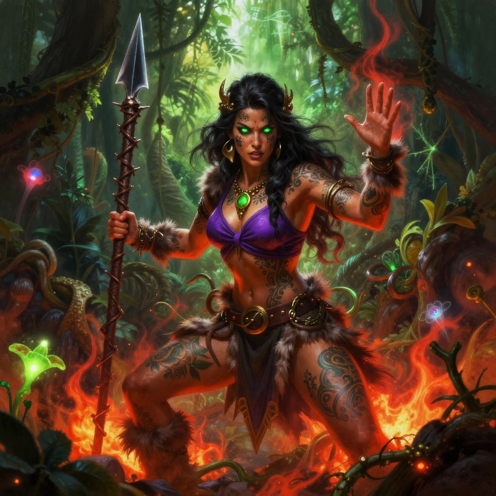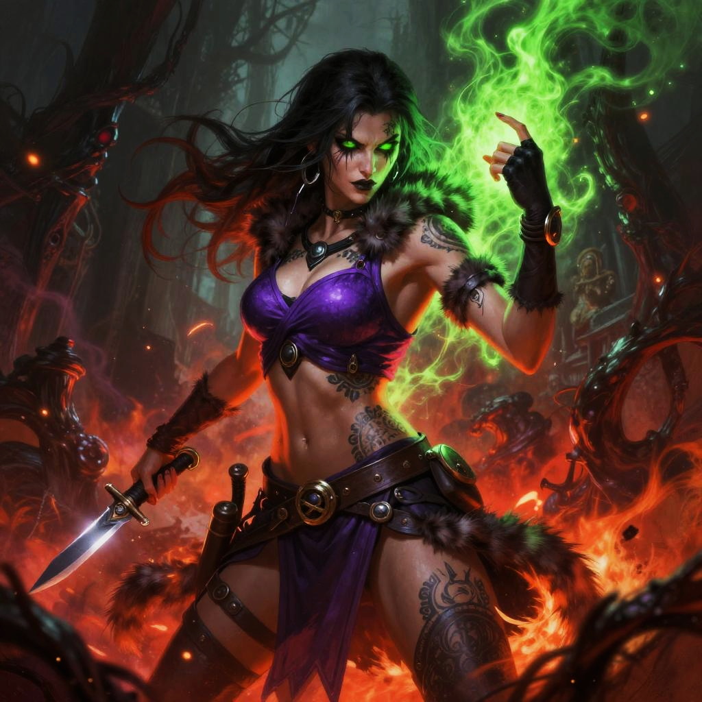 This is a vibrant digital painting of an icy silver-haired glacial mage woman with glowing eyes and tattooed skin, clad in a purple top, fur armbands, and a belted skirt. She brandishes a frostbound shard blade and holds an aggressive stance with one hand raised. The scene surges with fiery red and eerie green energy, surrounded by ice crystal formations and swirling blizzard, embers, and arcane currents, ultra-detailed, dramatic lighting, high contrast.