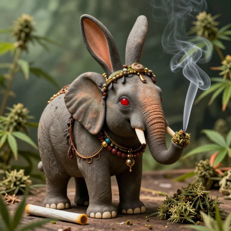 Digital artwork of a decorated gray elephant with red eyes, smoking a cigarette, adorned with jewelry, surrounded by cannabis plants.
