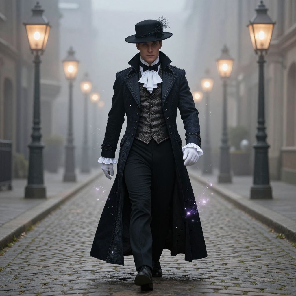 Photograph of a mysterious man walking down a foggy, cobblestone street at night. He wears a long, black, Victorian-style coat with intricate patterns, a black waistcoat, white cravat, and white gloves. His black top hat is adorned with a small, decorative feather. He steps forward with a confident stride, his face partially obscured by shadows. The street is lined with old-fashioned black street lamps, their warm yellow light casting a glow through the mist. The background fades into a soft blur, emphasizing the man's central position and enigmatic presence. Sparkles surround his gloved hand, adding a magical, ethereal touch.