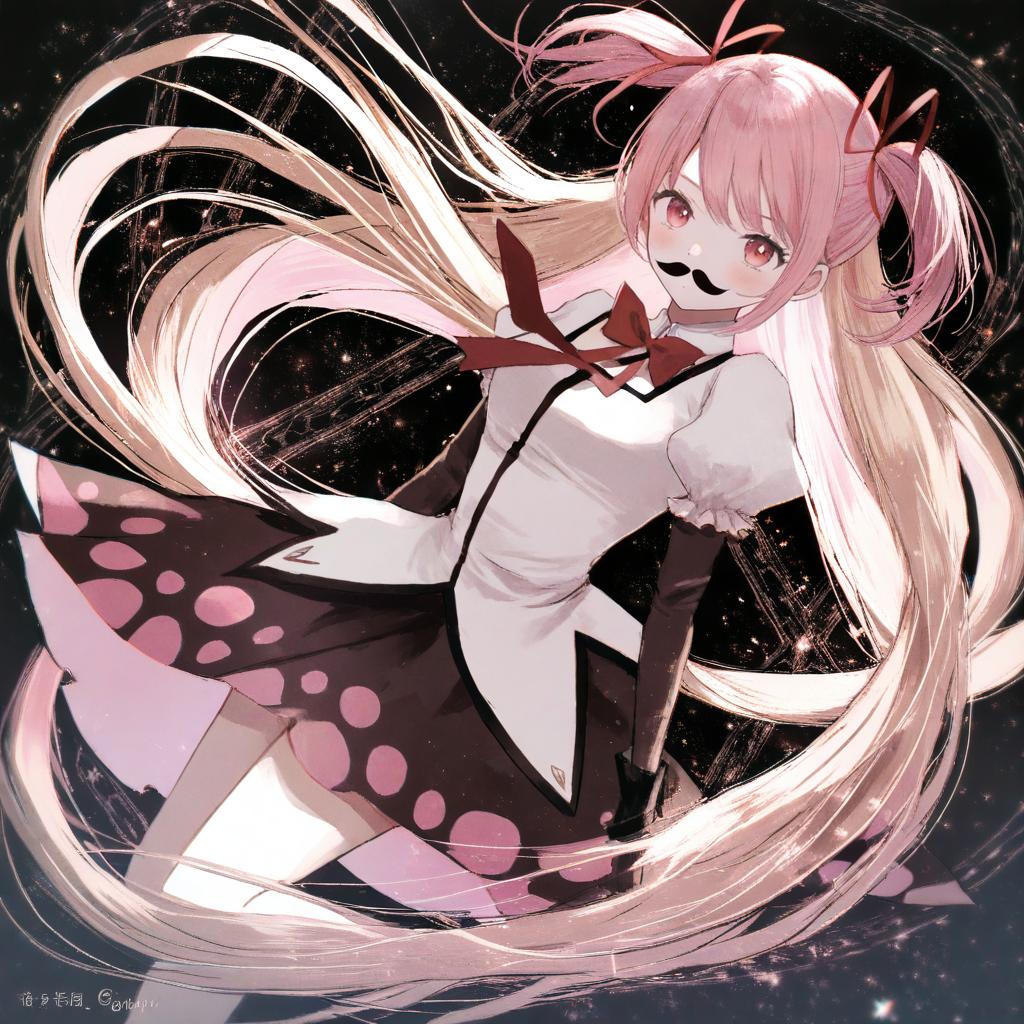 Anthony (madoka magica), mahou shoujo madoka magica, 1girl, mustache, yellow eyes, pink hair, blonde hair, absurdly long hair, long hair, two side up, magical girl, by artist sakuyu, animagine