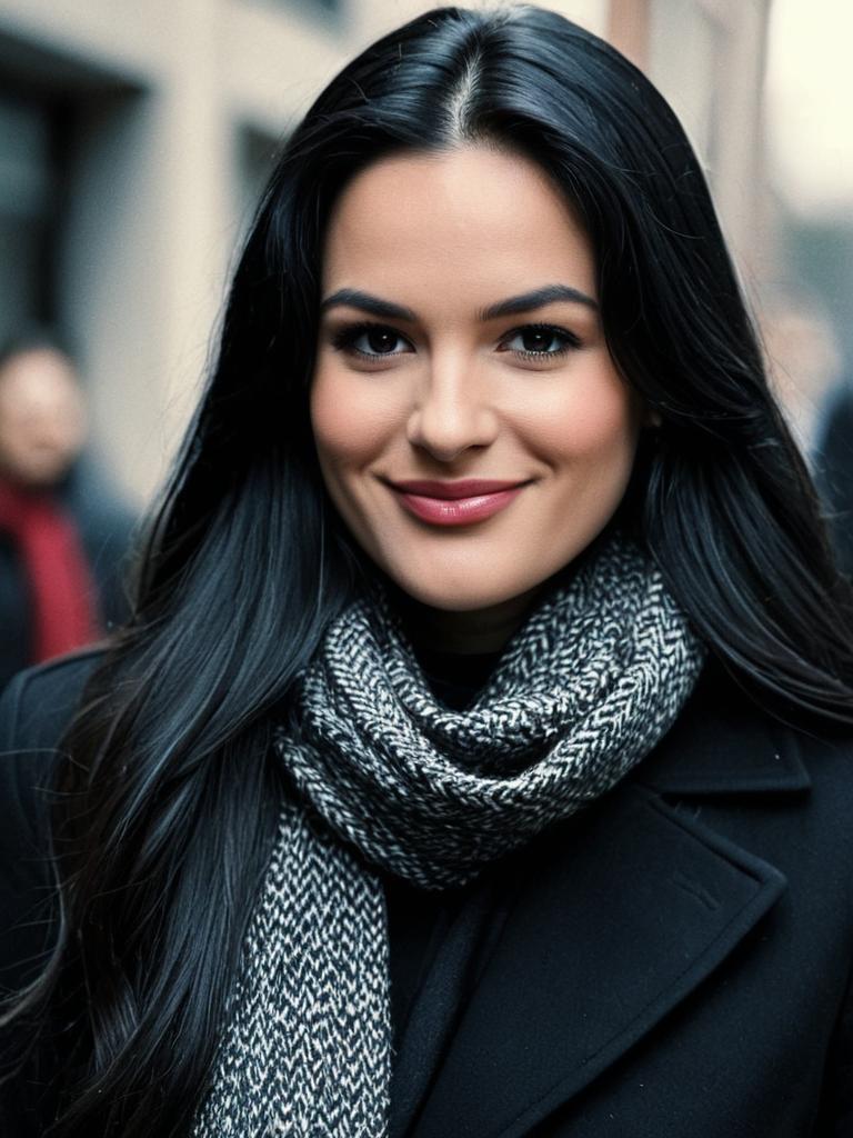 Godfather female costume, 1girl, solo, looking at viewer, realistic, blurry, blurry background, upper body, black hair, scarf, lips, long hair, photorealistic, smile, closed mouth