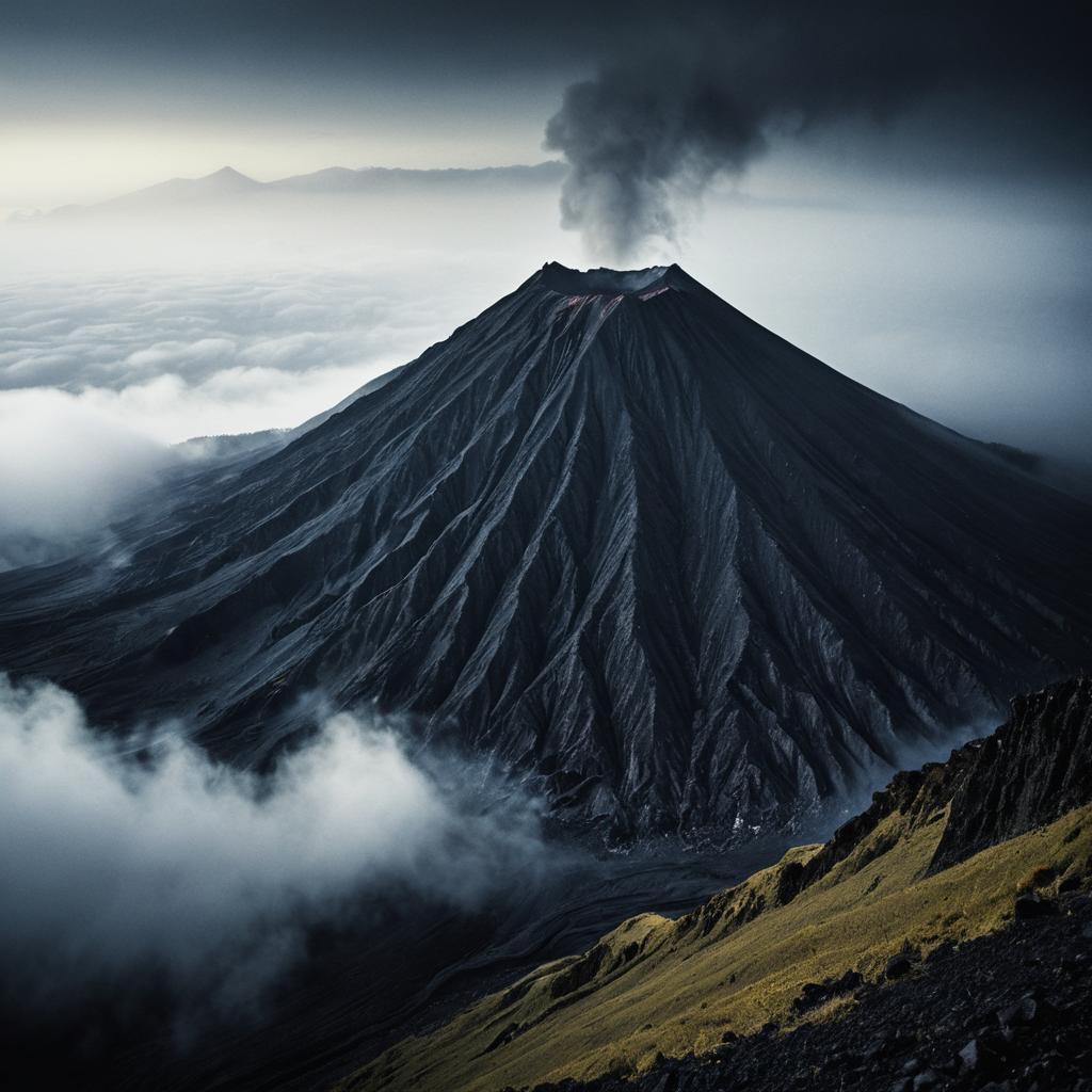 Dramatic view of an erupting volcano emitting dark smoke, surrounded by dense fog and mist. The volcano's textured slopes descend steeply, with a cliff edge partially visible in the foreground. The lighting enhances the mysterious and eerie atmosphere of the scene.