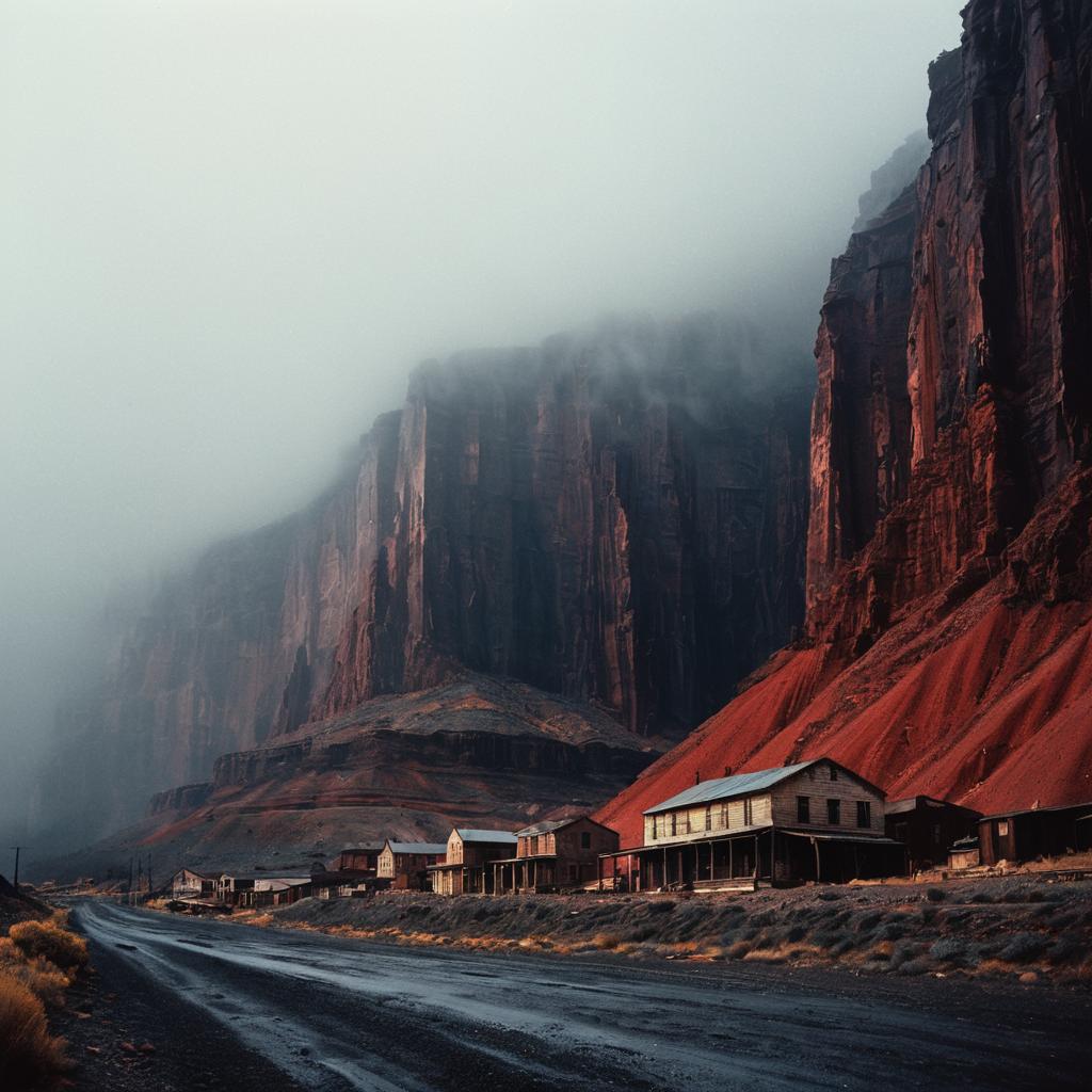 Painting of a fog-covered volcano crater shrouded in mist, towering on a cliff, dramatic lighting, mysterious and slightly eerie mood.