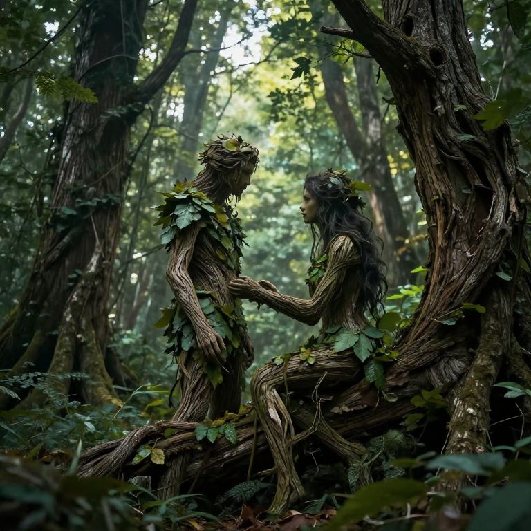 Reflective forest elder god, body made of twigs, thin trunks and leaves, primitive, forest background, cinematic quality, hyper realism, high quality, 8k,