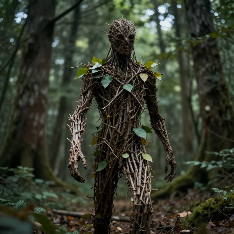 Hyper-realistic image of a forest elder god figure composed entirely of intertwined twigs, thin trunks, and green leaves. The humanoid figure stands in a dense, misty forest with a primitive and natural aesthetic. The scene features cinematic lighting and high detail, emphasizing the texture of the wood and foliage.