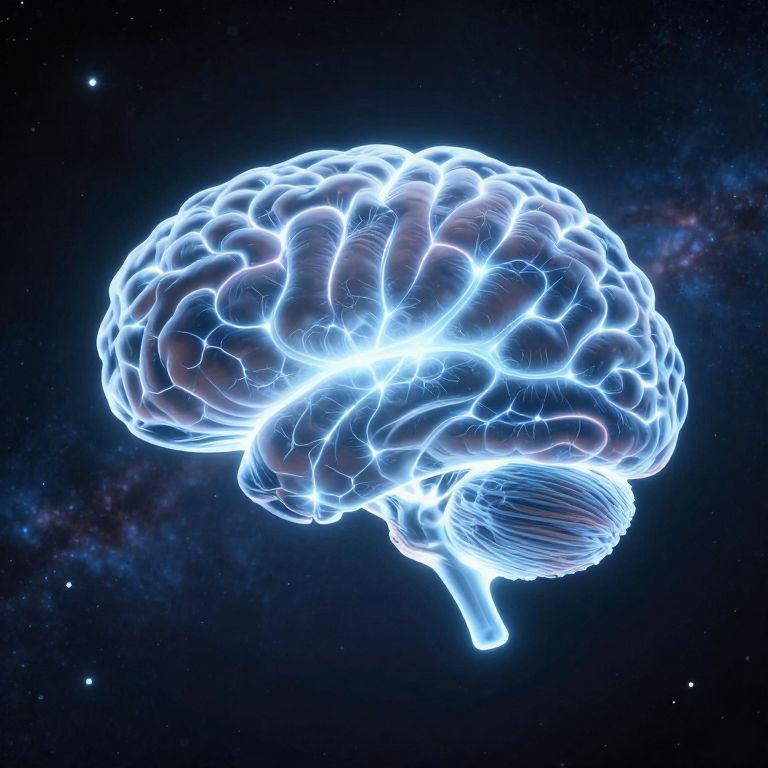 A luminous, brain-shaped celestial entity floats serenely against a cosmic backdrop, its glowing neural pathways radiating like bioluminescent thoughts, defying the boundaries between organic life and the vast expanse of space.