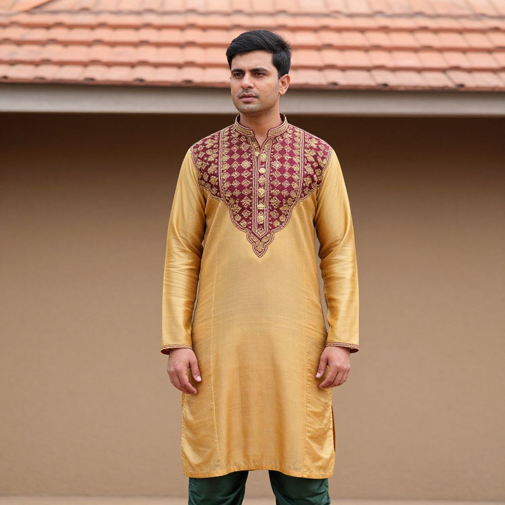 Photograph of a bearded man with short dark hair, standing against a plain beige background. He's wearing a dark blue, long-sleeved traditional outfit adorned with intricate gold embroidery on the chest and sleeves. The fabric has a subtle shimmer. He looks directly at the camera with a neutral expression. The overall style is elegant and formal.