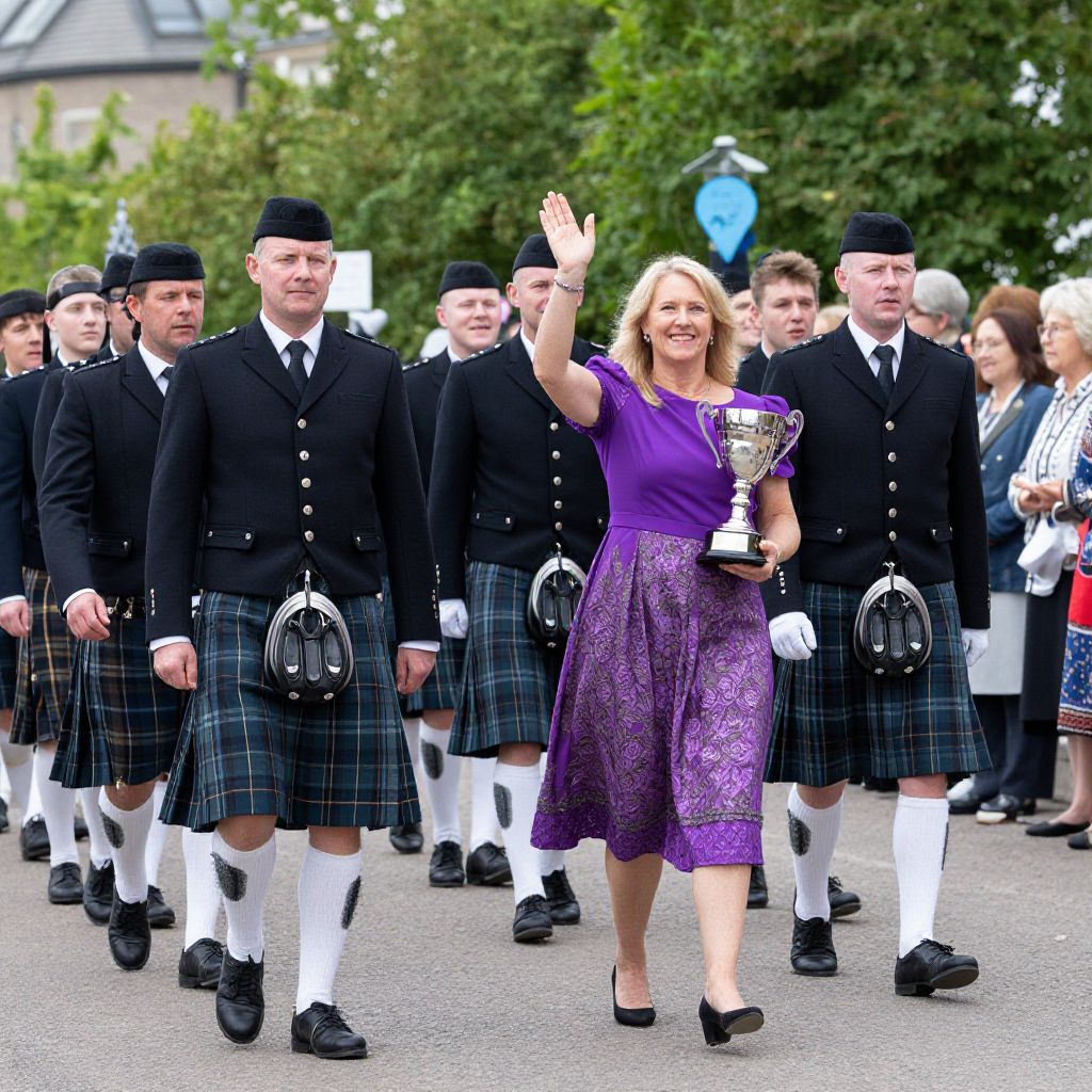 Royal pageant participants in traditional Highland attire march alongside a woman in a vibrant purple dress, waving and holding a ceremonial trophy, during the 2015 Blantyre Gala Day on 27th June.