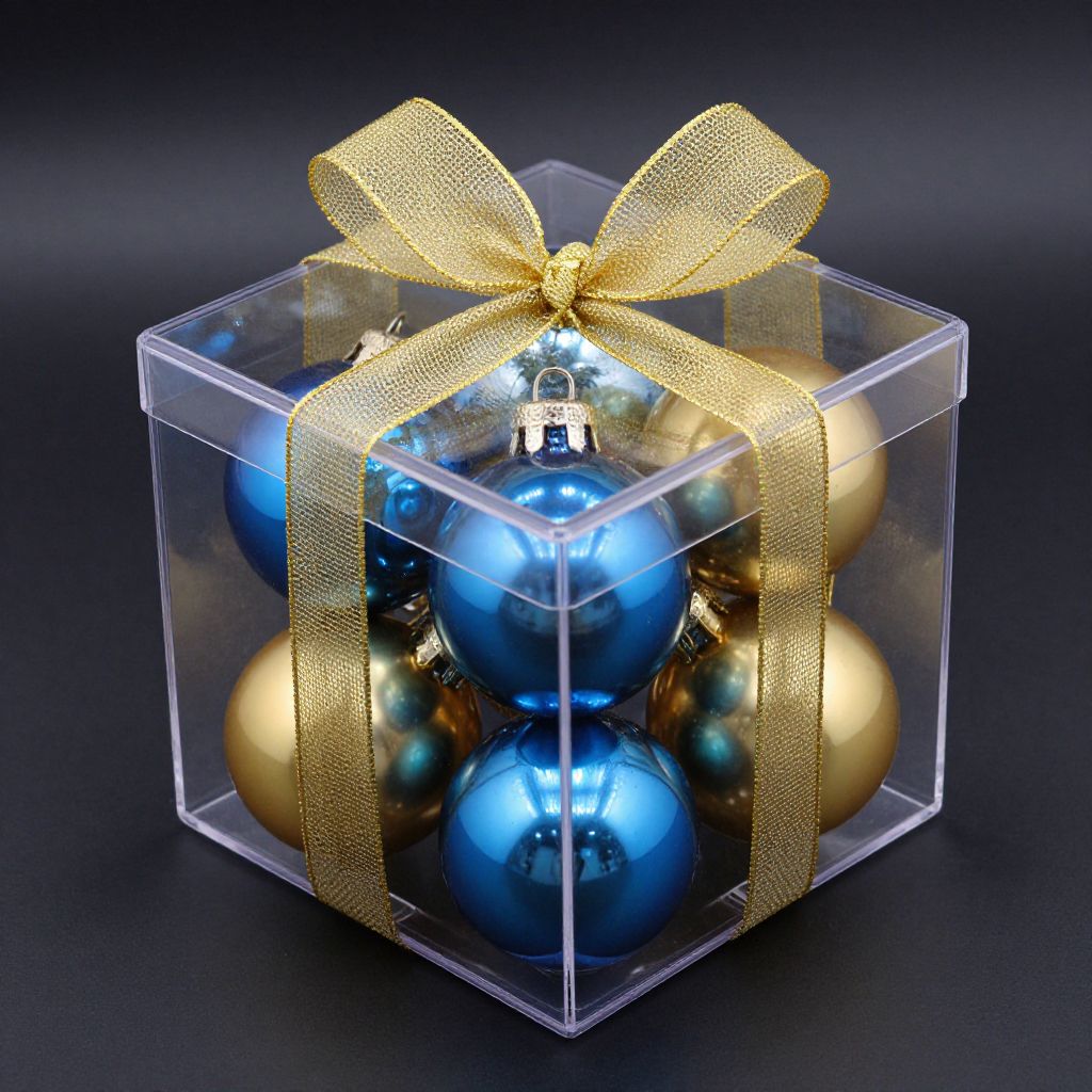 Clear plastic cube-shaped container holds a festive arrangement of five shiny metallic ornaments, including two gold and three blue spheres, delicately wrapped in a golden mesh ribbon atop its lid, serving as elegant holiday decor.