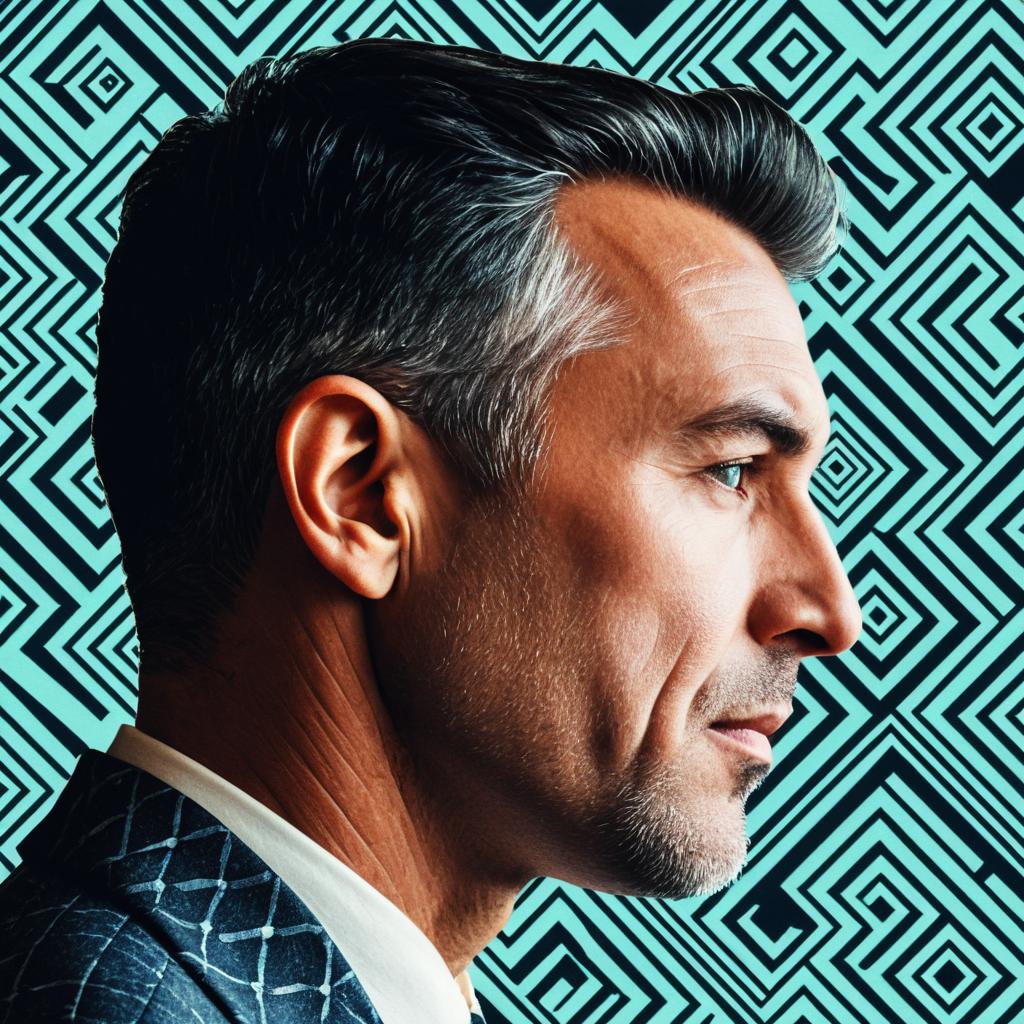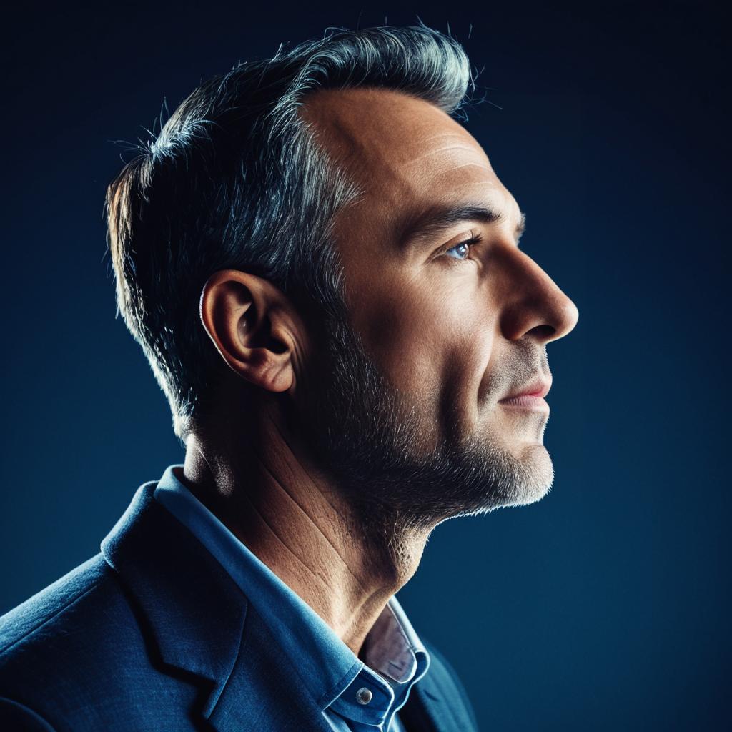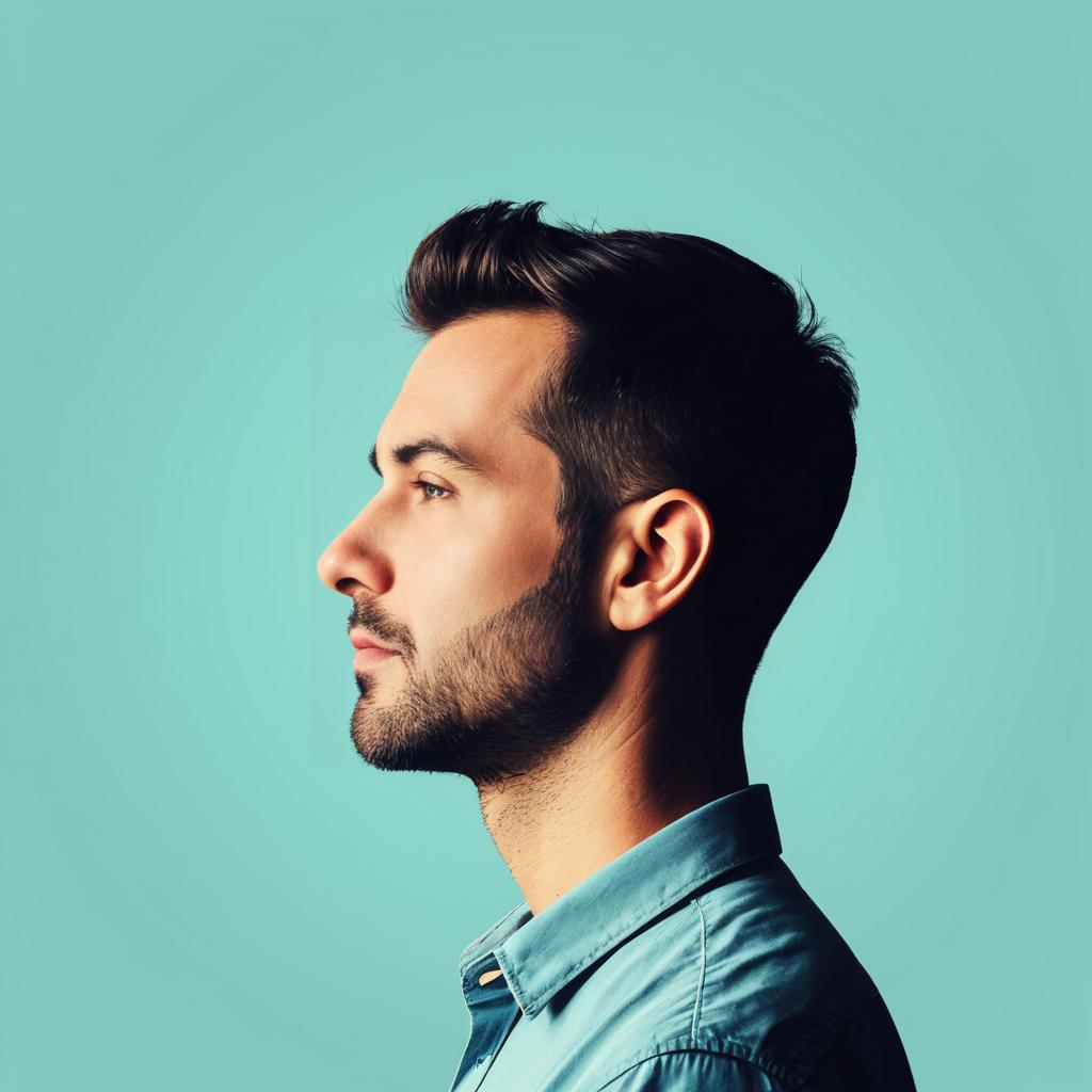 Side profile of a smart-looking man with neatly styled black hair and beard, wearing a light blue dress shirt and black tie, set against a minimal gradient blue background. The image captures a clean, professional appearance with sharp facial features and a confident expression.
