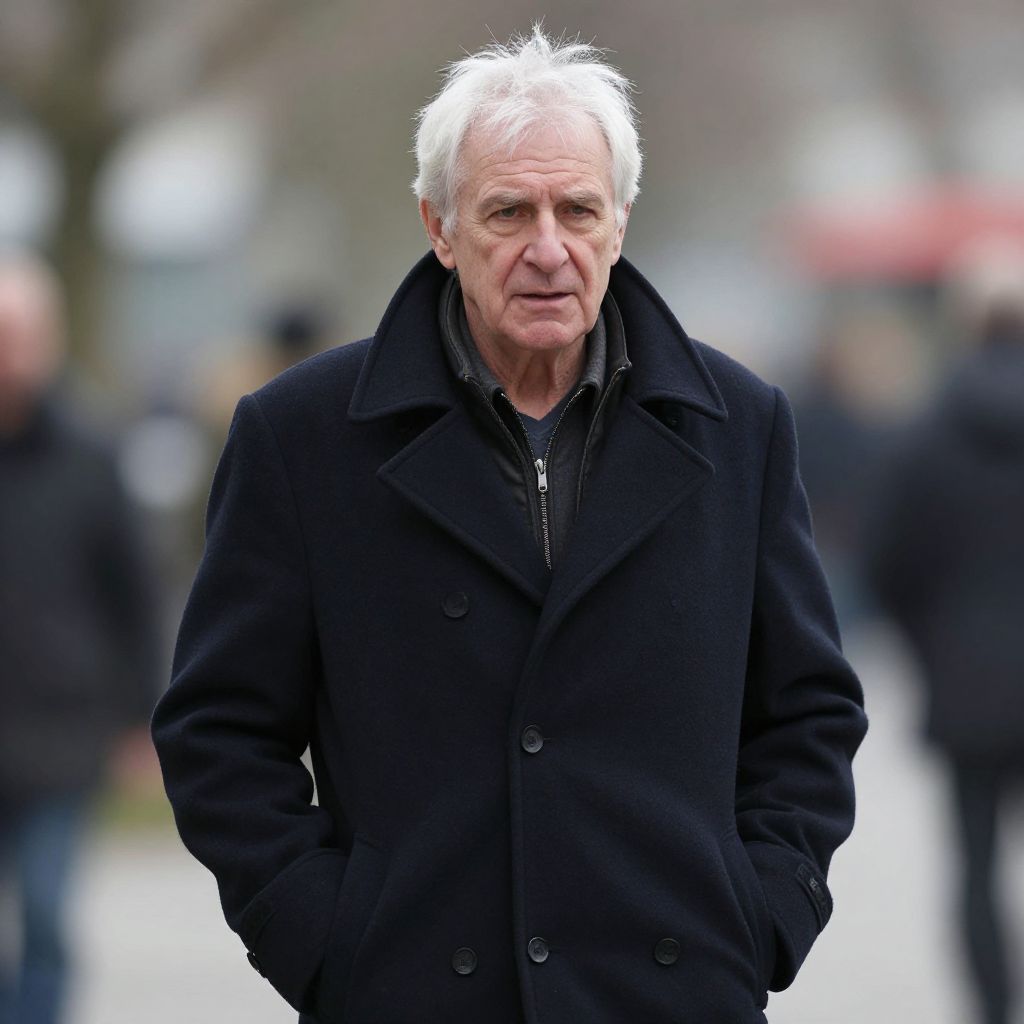 Photograph of an elderly white man with striking white, slightly tousled hair and a stern expression. He is wearing a black, double-breasted coat over a dark shirt, with his hands in his coat pockets. The background is blurred, showing an outdoor setting with indistinct figures and trees, suggesting a cold, urban environment. The man's sharp facial features and intense gaze are prominent, contrasting with the muted, overcast colors of the surroundings. The overall composition emphasizes the man's presence against the soft-focus background.