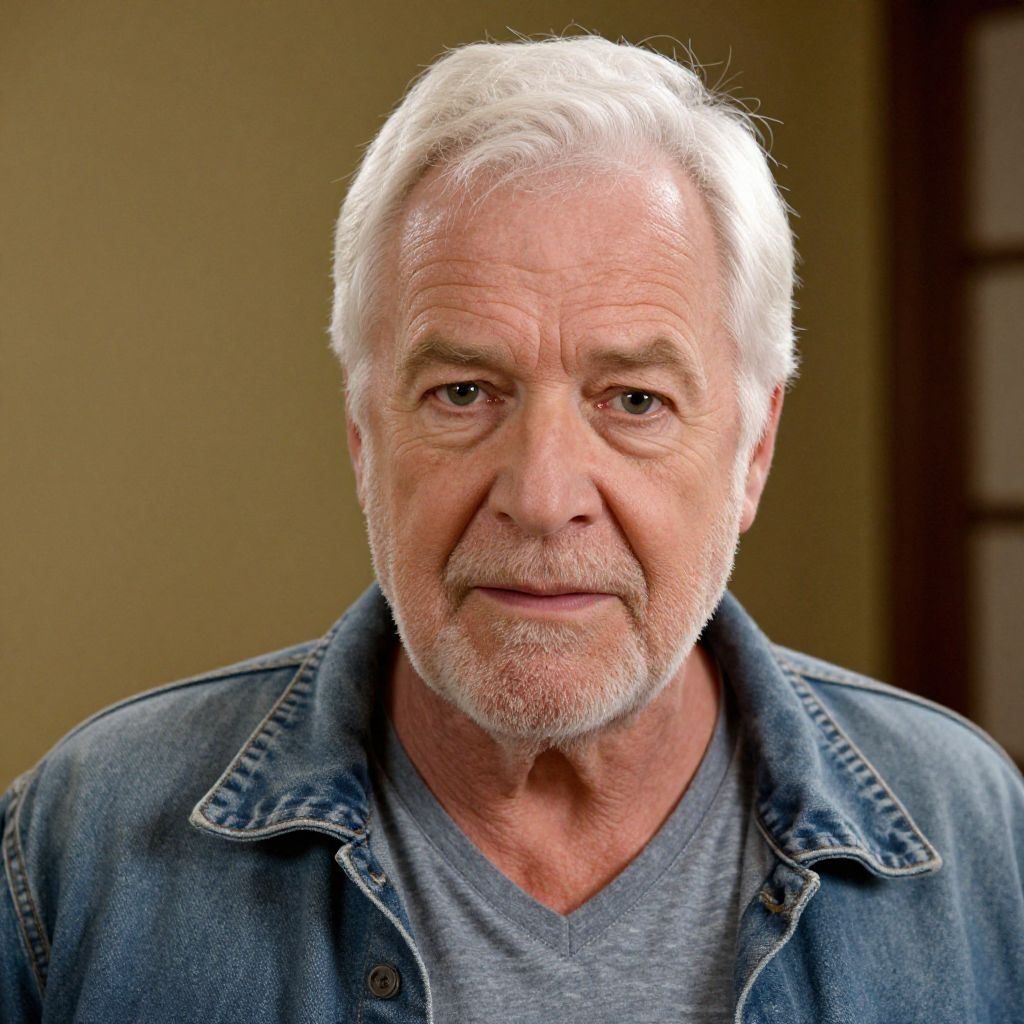 Photograph of an elderly white man with white hair, wearing a black coat and black shirt, standing outdoors with a blurred background. Hands in pockets,