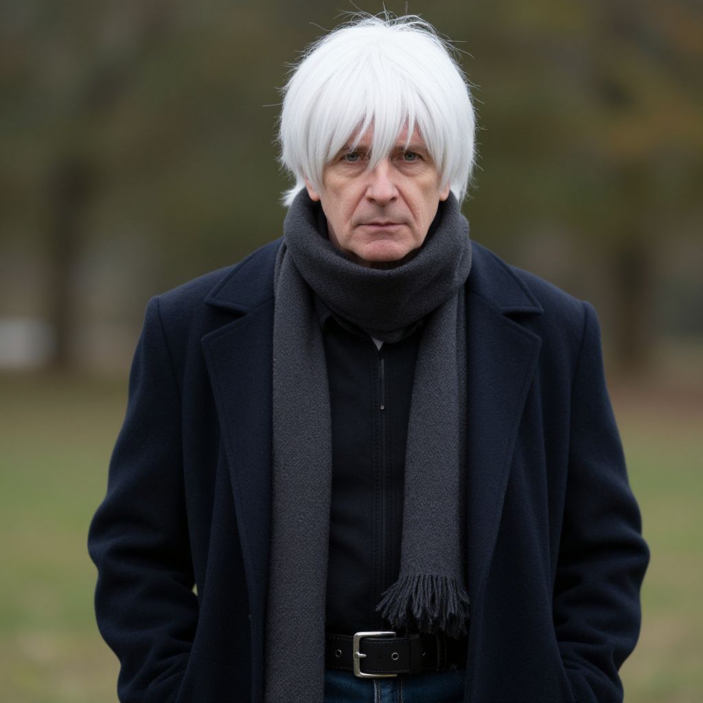 "man overcoat costume, 1boy, male focus, solo, coat, hands in pockets, old, blurry, outdoors, blurry background, old man, upper body, white hair, black coat Realistic photo of casual sexy person with pretty face"