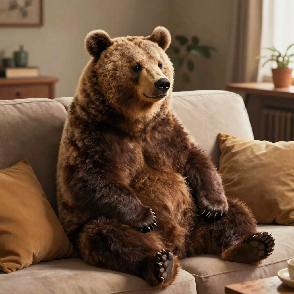 Bear sitting on couch in a cozy living room, surrounded by warm lighting and soft cushions, relaxed and gazing thoughtfully, realistic fur texture, natural earthy colors, high detail, digital painting style