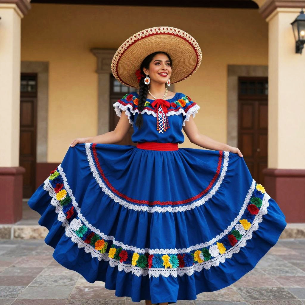 Young woman dressed in a traditional Mexican style white dress with colorful floral embroidery, a large straw sombrero, and gold earrings. She has long dark braided hair and is standing outdoors in front of a building with arches.