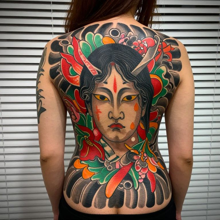Colorful Japanese Full-Back Tattoo