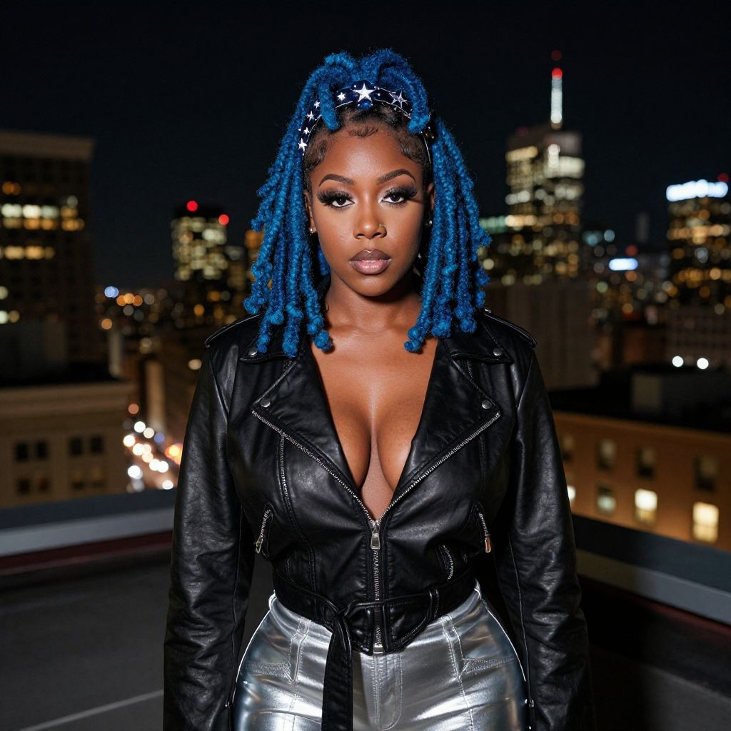 Photograph of a Black woman with vibrant blue dreadlocks adorned with star-shaped hairpins. She has a dark brown complexion and full lips with subtle makeup. She wears a black leather jacket with a deep V-neck, revealing cleavage, and shiny silver high-waisted pants. The background is a cityscape at night, with blurred, illuminated skyscrapers and lights. The woman stands on a rooftop, with a railing visible behind her. The image has a high-contrast, dramatic lighting that highlights her features and outfit against the dark, urban backdrop.