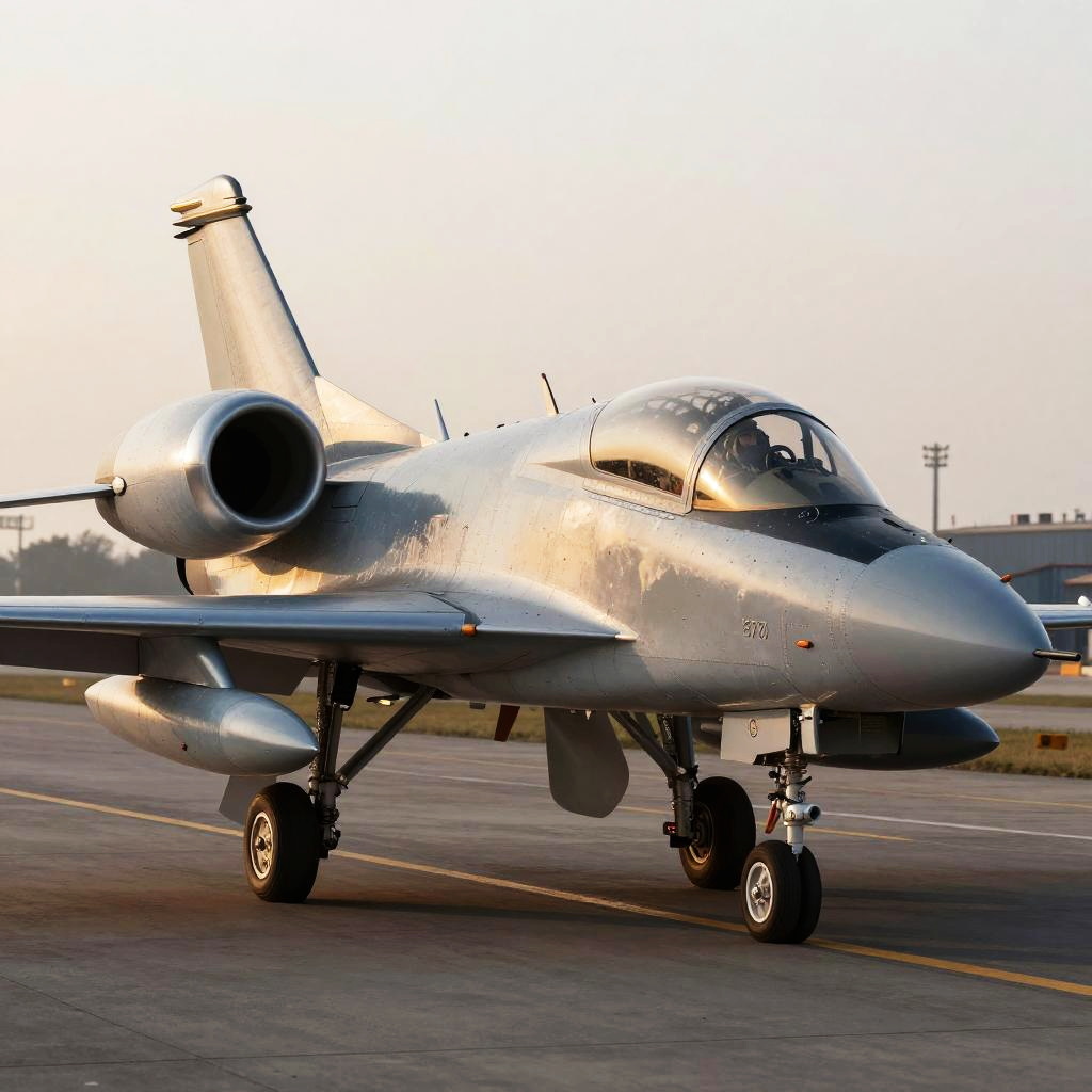 Challenger 75 jet fighter on the runway at dawn, battle-ready stance, highly detailed cockpit and pilot visible, weathered industrial environment, subtle smoke and dust effects, focus on aerodynamic curves and advanced weapon systems, hyper-realistic style.