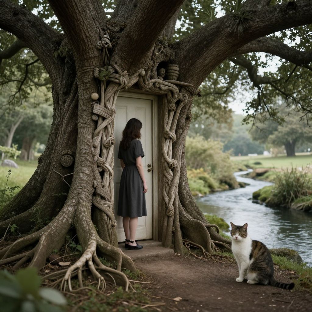 A woman stands at the threshold of a door carved into the gnarled trunk of a living tree, its roots extending like skeletal fingers into a serene landscape where a tranquil stream meanders past a contemplative cat, blurring the line between nature and fantasy.