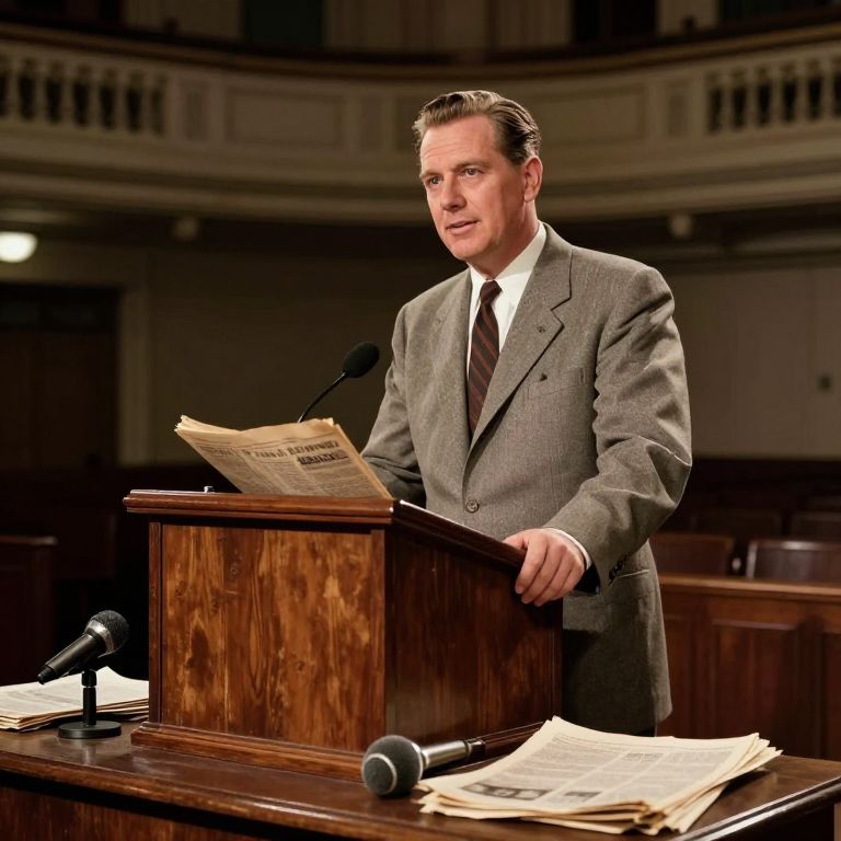 Announcer standing behind a vintage wooden podium in a grand hall, spotlight illuminating his confident expression, old newspapers and microphones scattered on the desk, 1950s style, warm tones, cinematic lighting, highly detailed, photo-realistic style.