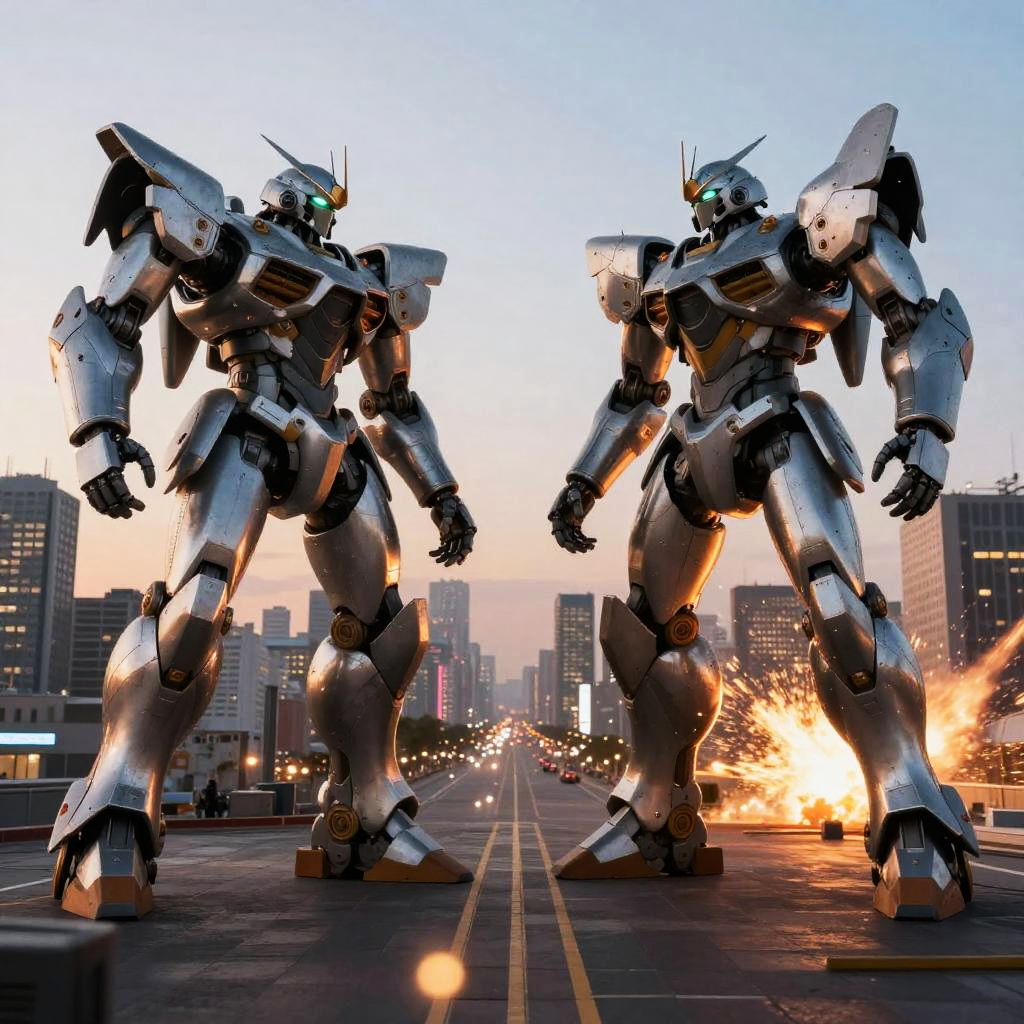 Photorealistic CGI of two towering, silver mecha robots with glowing green eyes, standing on a city highway at sunset, firing weapons, with explosions