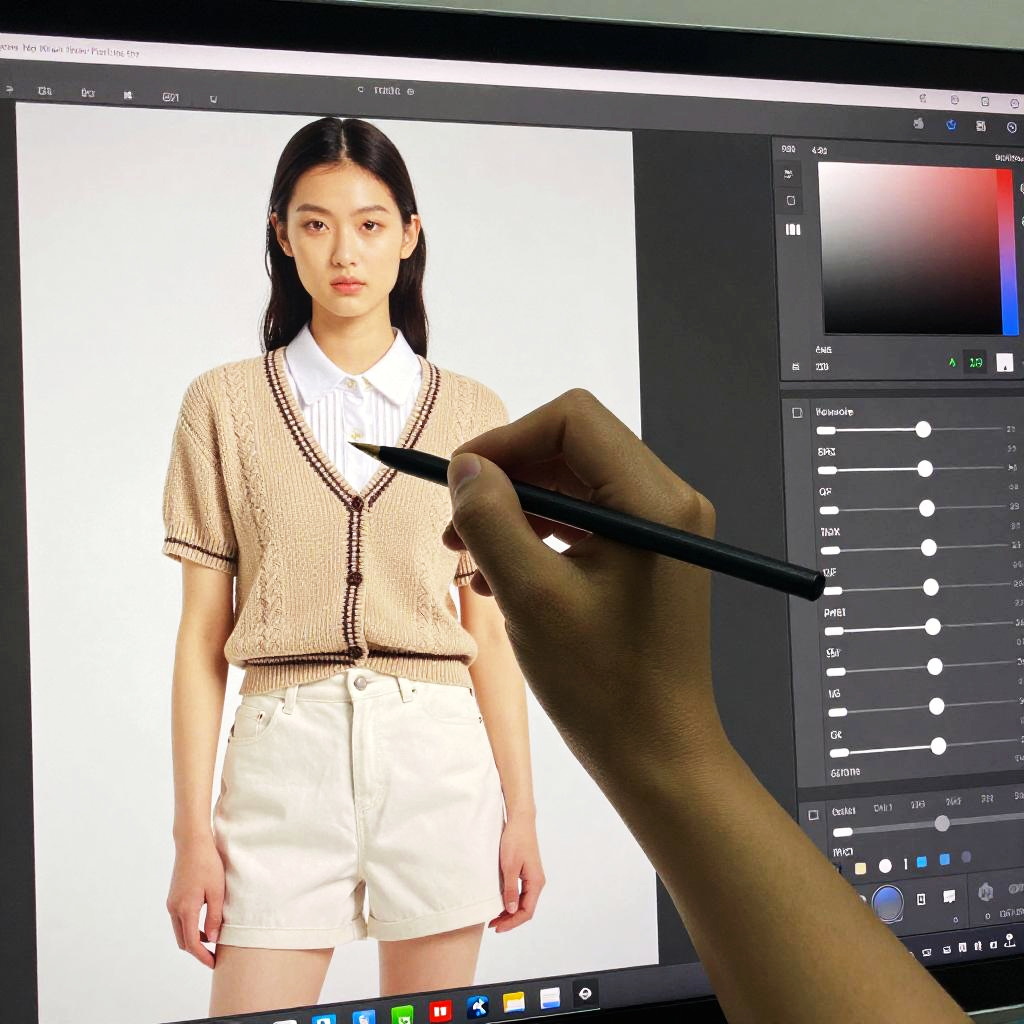 Photo clothing editor digitally enhancing a model's outfit photo, advanced retouching tools with intuitive sliders, layered editing interface, fashion photography studio setting, realistic textures, modern and creative atmosphere, bright and vibrant colors