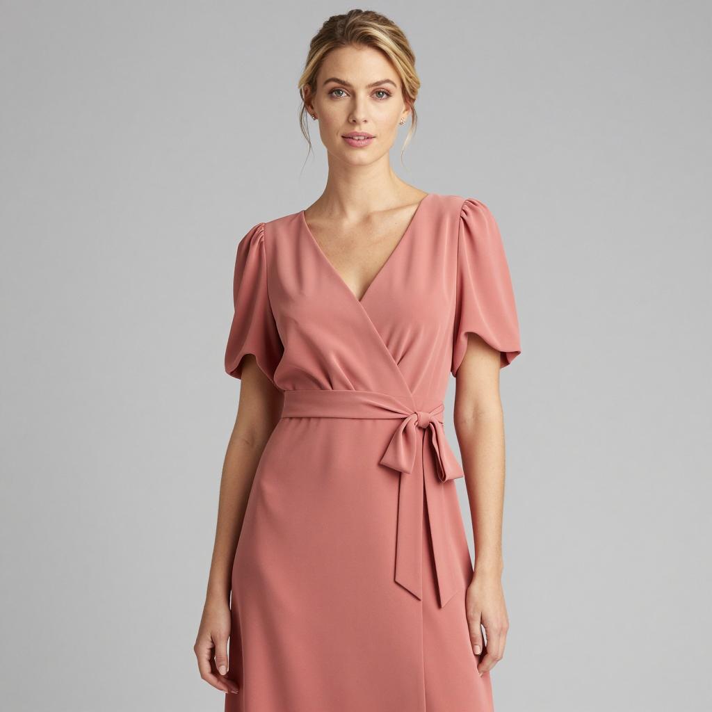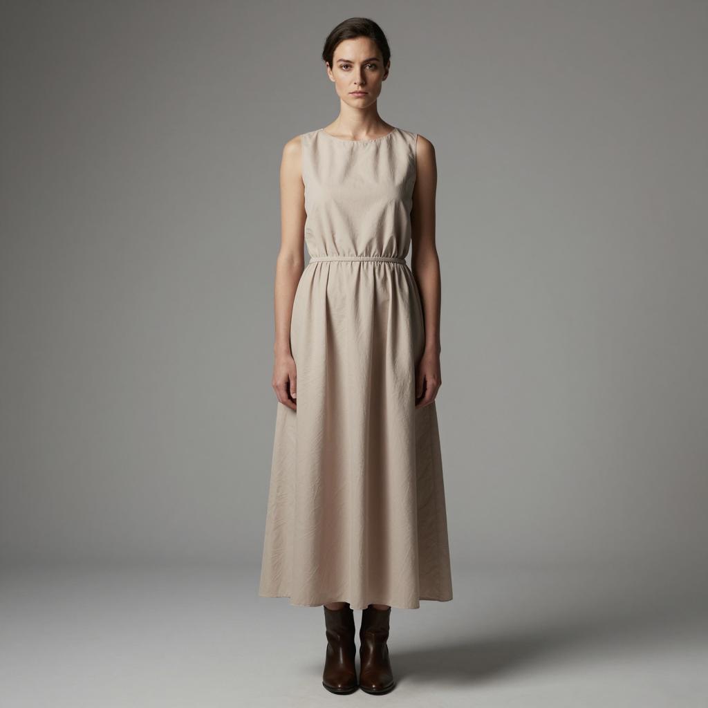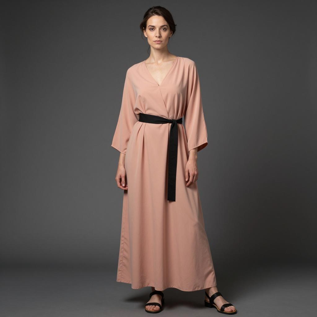 Larp outfit, photorealistic portrait of woman, standing, dark gray background, wearing long peach-colored dress with black belt, 3/4 sleeves, V-neck, black sandals, dark brown hair pulled back, minimal makeup, neutral expression, studio lighting, full body shot, slight shadow under dress, casual style