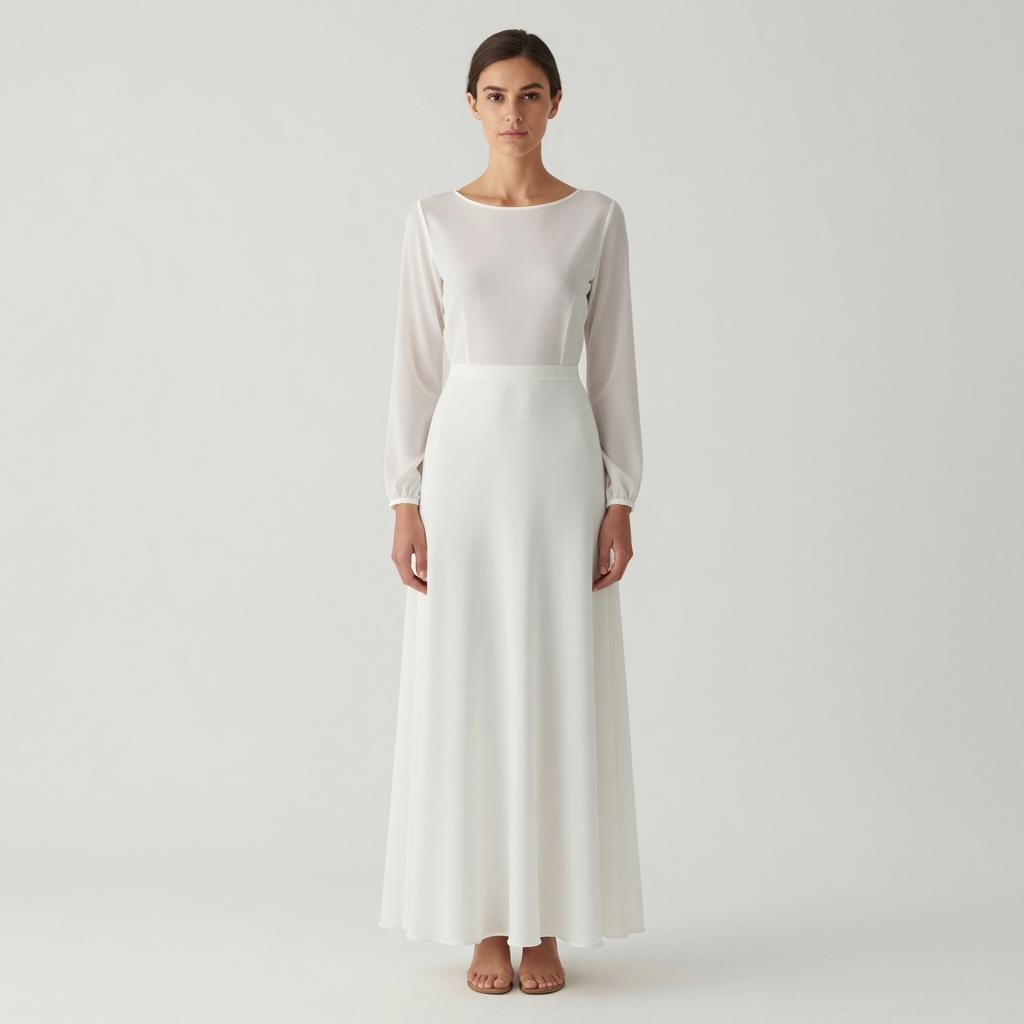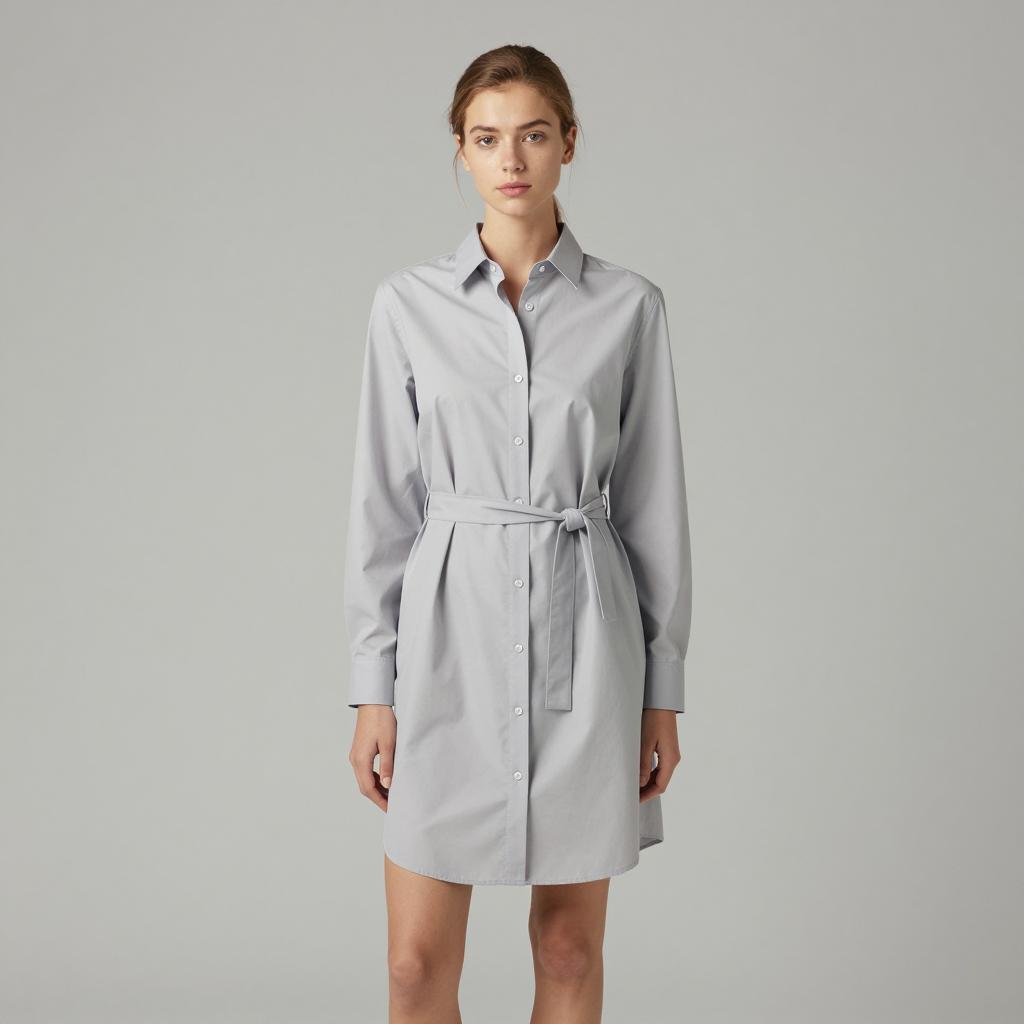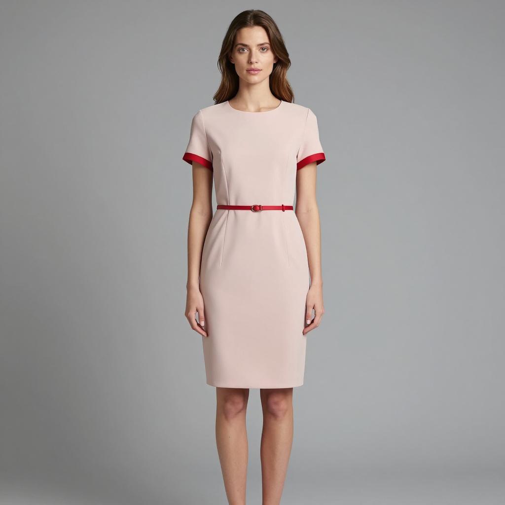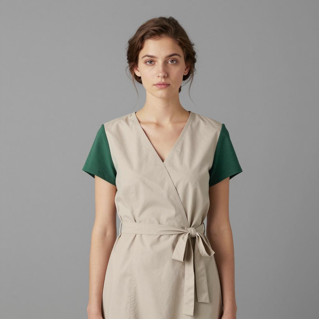 Larp outfit, photorealistic portrait of woman, standing, dark gray background, wearing long peach-colored dress with black belt, 3/4 sleeves, V-neck, black sandals, dark brown hair pulled back, minimal makeup, neutral expression, studio lighting, full body shot, slight shadow under dress, casual style